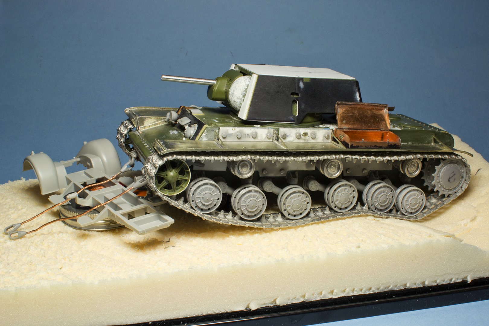 3) Экранированный КВ-1 из той-же 3-1 тд., потерянный под Островом. Сама модель - сборная солянка из остатков Тамии, Трампа и Звезды, но вроде потихоньку вырисовывается...