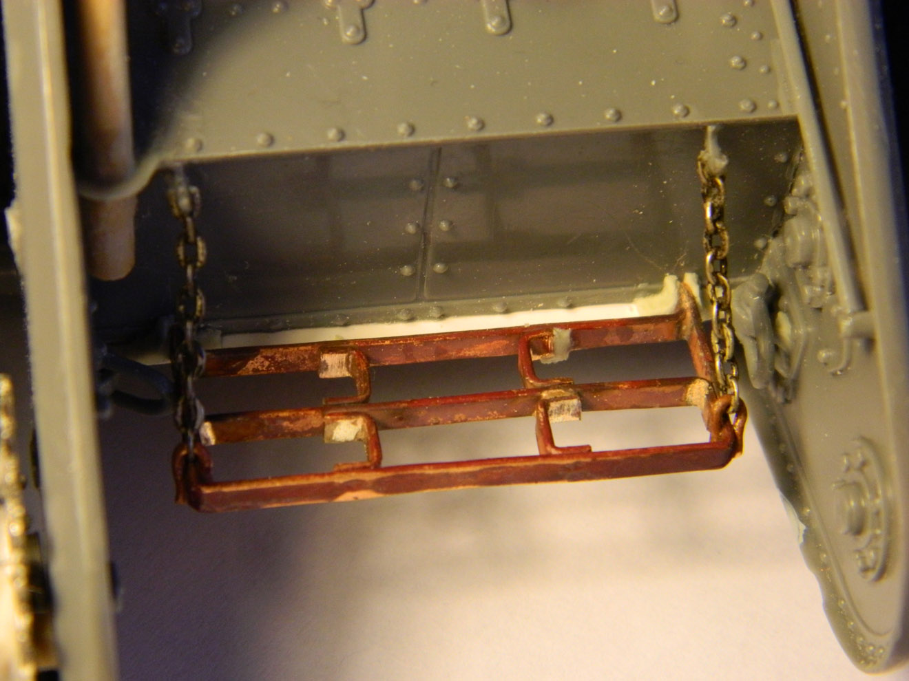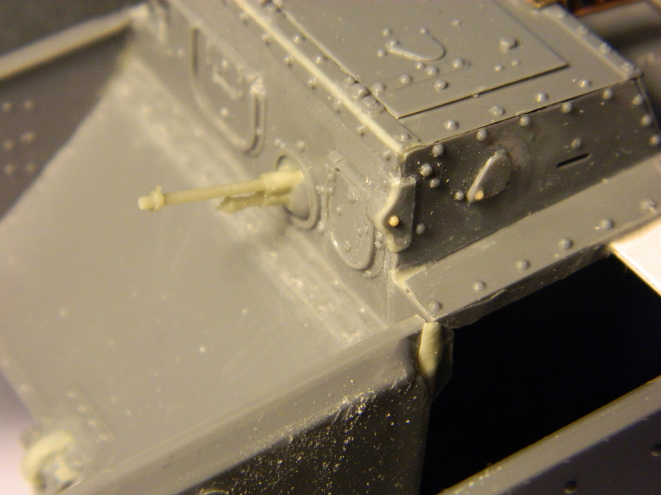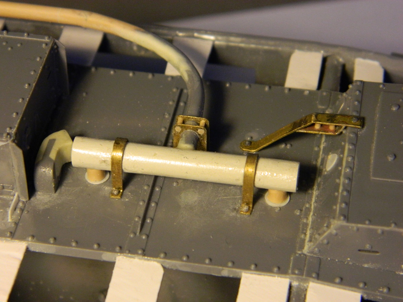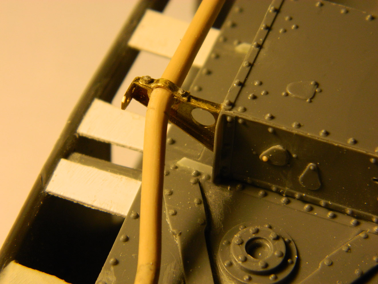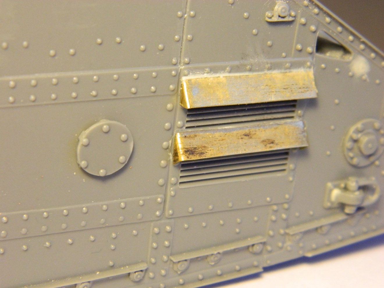 Что имеется уже на сегодня? В разгаре работа над танком Mark-V от фирмы Interus. Те, кто сталкивался, знают - модель не из простых, если делать по-хорошему. Практически всё, что выставляется над бронёй, пришлось переделывать, да и саму броню производитель сделал с косяком - расшивка бортов воспроизведена не в виде щелей, а рельефными валиками, напоминающими скорее сварные швы. Их пришлось соскоблить и прочертить щели. Глушитель имел мало общего с настоящим - изготовлен новый. Воздухозаборник рядом с ним тоже: его форму производитель просто напросто придумал. Кое-где добавлены недостающие, забытые производителем детали. Много работы потребовала корма танка - добавлены маслопроводы, ведущие к звёздочкам, изготовлена откидная решётка, которую производитель не воспроизвёл, но которая была практически на всех машинах.