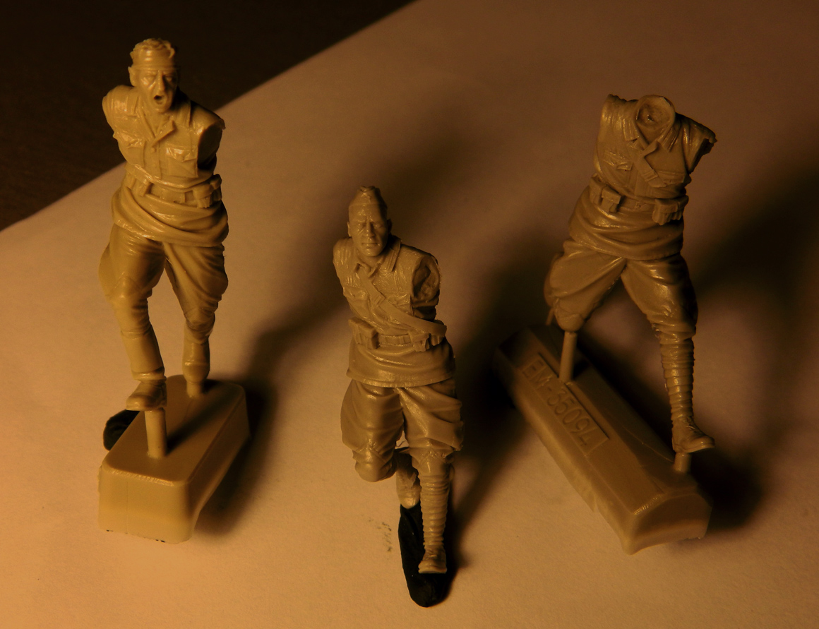 При выборе кандидатур на переделку в белогвардейцев, я сразу остановился на серии великолепных экшн фигур от Evolution Miniatures (имеются в виду контратакующие советские солдаты на 1941 год). Объективно по скульптуре это лучшее, что можно найти в подобной униформе. Конкуренцию, пожалуй, могут составить лишь несколько солдат от «Танка». Выбрал несколько наиболее приглянувшихся фигур: в первую очередь бойцы в обмотках. Почему-то сразу они представились мне корниловцами.