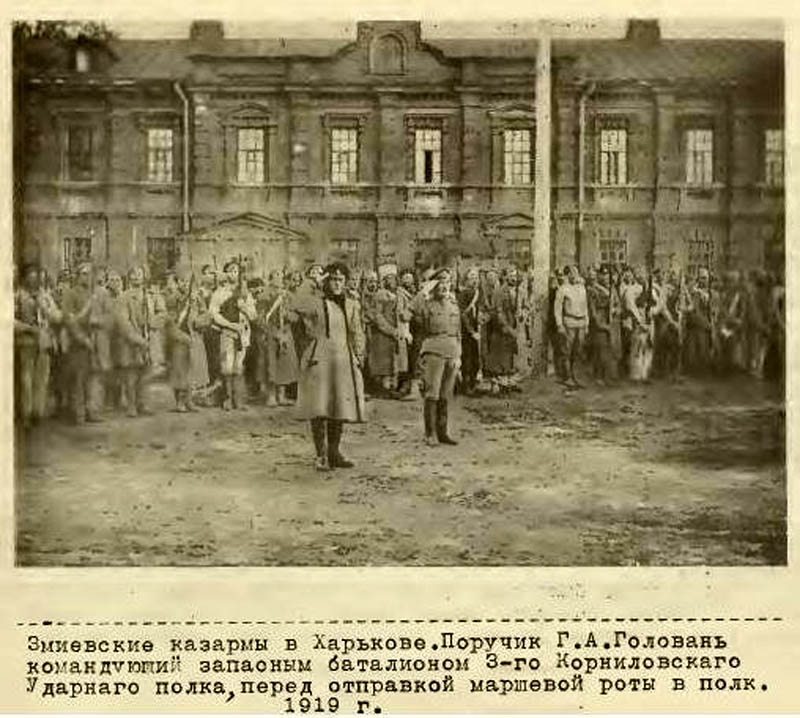 «На другой день, 12 июня, весь Дроздовский полк стянулся в город. Батальоны отдыхали в казармах на Старомосковской улице. Началось их усиленное обучение, а пополнились мы так, что 2-й офицерский полк развернулся после Харькова в целых три полка. Все наши новые добровольцы торопились "построить" себе дроздовские фуражки, надеть погоны. Город, можно сказать, залило нашим малиновым цветом, тем более что на складах нашлась бездна цветного сукна. Нас так ждали в Харькове, что один тамошний шапочник заранее заготовил сотни фуражек белых полков и теперь бойко торговал ими»