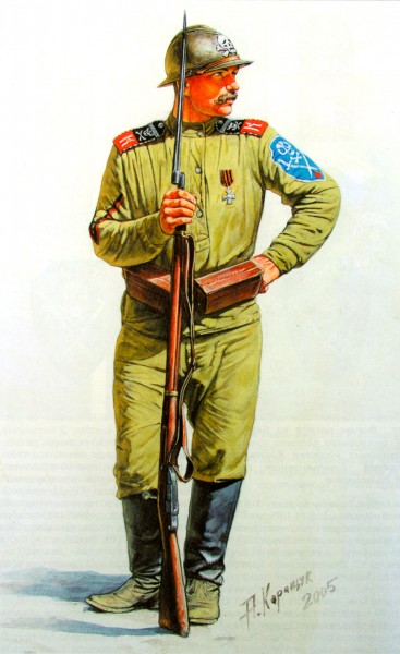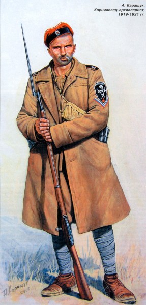 А вообще, для воссоздания облика корниловцев посоветую не пользоваться картинками из современных книжек и журналов, а почитать воспоминания участников событий. К сожалению моделисты, занимающиеся этим периодом, в большинстве своём полагаются на рисунки из "Цейхгауза" №1, искренне веря, что поголовно все корниловцы постоянно были в чёрных гимнастёрках и ярких цветных фуражках. Что на самом деле было далеко не так.