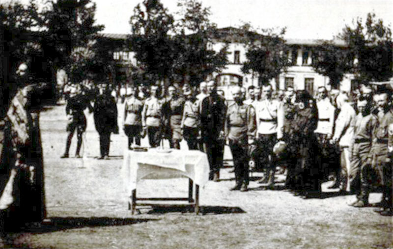 "..."Назначенным на службу в полки вверенной мне дивизии офицерам-перебежчикам и мобилизованным запрещаю носить форму полка и предписываю носить погоны защитного цвета. Командирам полков и лицам, равным им по власти, предоставляю право разрешать ношение полковой формы тем из числа вышеуказанных офицеров, которые своей боевой службы удостоятся этой высокой боевой чести..."