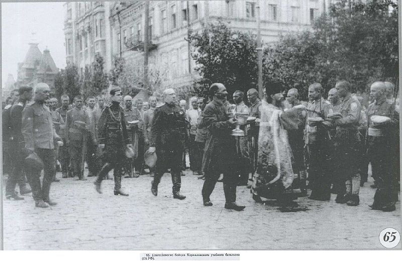 Непонятно только что значит в тексте "а 3-й — в мешечное"? Местное, быть может? В любом случае это свидетельствует, что даже в одном полку разные батальоны одеты по-разному. А число полков доходило до трёх. На фото из Харькова, приведённом SKL, видно, как выглядела маршевая рота 3-го полка в том же 1919 году. Вот фото того же 3-го полка с молебна 31 августа 1919 года.
