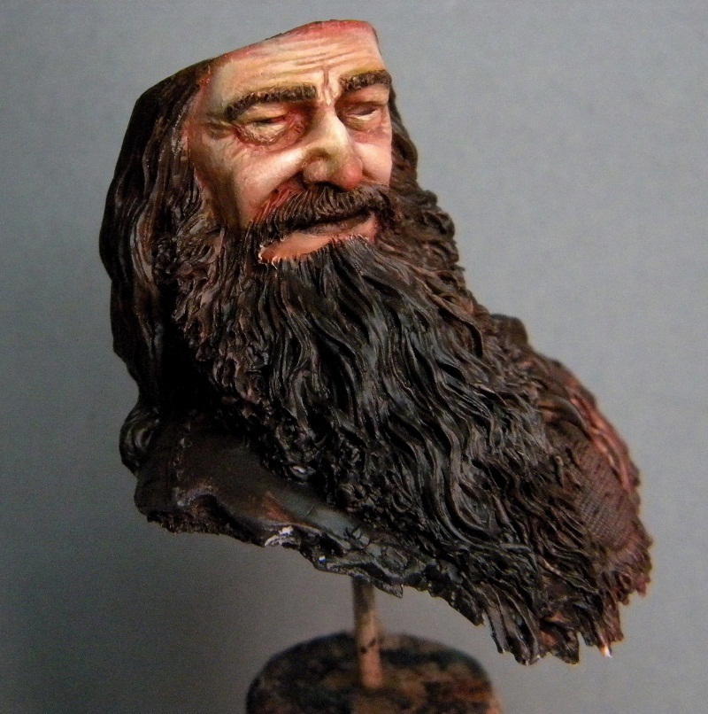 Следующим шагом я обработал акрил кожи смесью масла-сиенна жженая+неополитанская оранжево-желтая + билила титановые. Масло оживляет кожу поэтому на больших площадях оно просто не заменимо,по моему мнению. Самая большая ошибка многих кто рисует маслом кожу на миниатюрах - перебор с белилами в конечной стадии -получается кожа обработанная мукой(что особенно заметно на многих работах у Русского Витязя) Я же обычно масло использую в середине процесса- далее (после того как оно высохнет) я продолжу обрабатывать кожу акрилом. А пока масло сохнет -займемся бородой и волосами. Пока я даже не знаю с чего начну)Может быть сделать его седым как Гендальфа?)