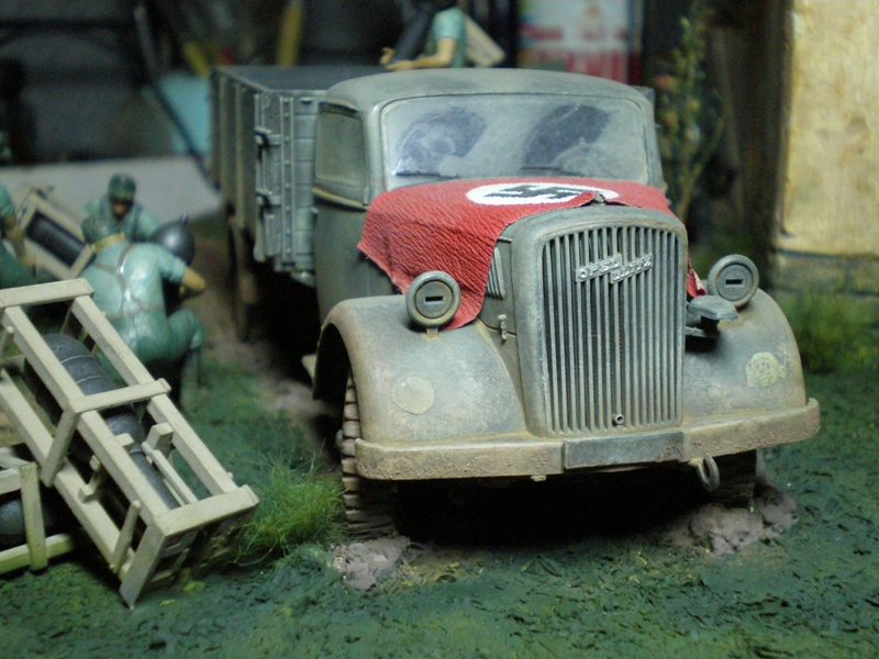 Однако, смысл происходящего остался мне непонятен: солдаты распаковывают реактивные снаряды и грузят их в кузов "Опеля"? А зачем? Перевозить их удобнее в упаковке, а распаковают боеприпасы обычно перед применением. Но ведь "Опель" - не пусковая установка...