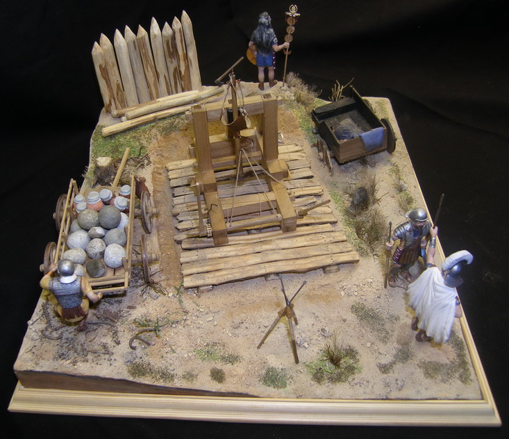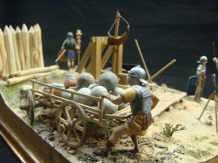 Выглядел он одиноко и я решился на небольшую миниатюру.Фигур подходящих не нашлось,решили реанимировать набор римлян Донецкого завода игрушек.С помощью милипута переделал шлемы,наплечники,оружие и вообще одежду.Сделали римскую телегу и брошенную дакийскую.Основание из фанеры задули строительной монтажной пеной, обработали ножом и наждачкой, создали рельеф. Зашпатлевали опять таки строительной готовой акриловой шпатлевкой. Гуашью придали нужный оттенок. Для грунта взяли песок, молотый кирпич, землю, старую перегоревшую штукатурку двух цветов,получилось пять оттенков грунта. Трава из пакли, мха,сушенного укропа и крашенных опилок, куст из веника.