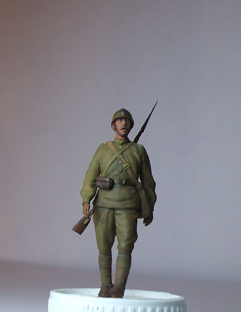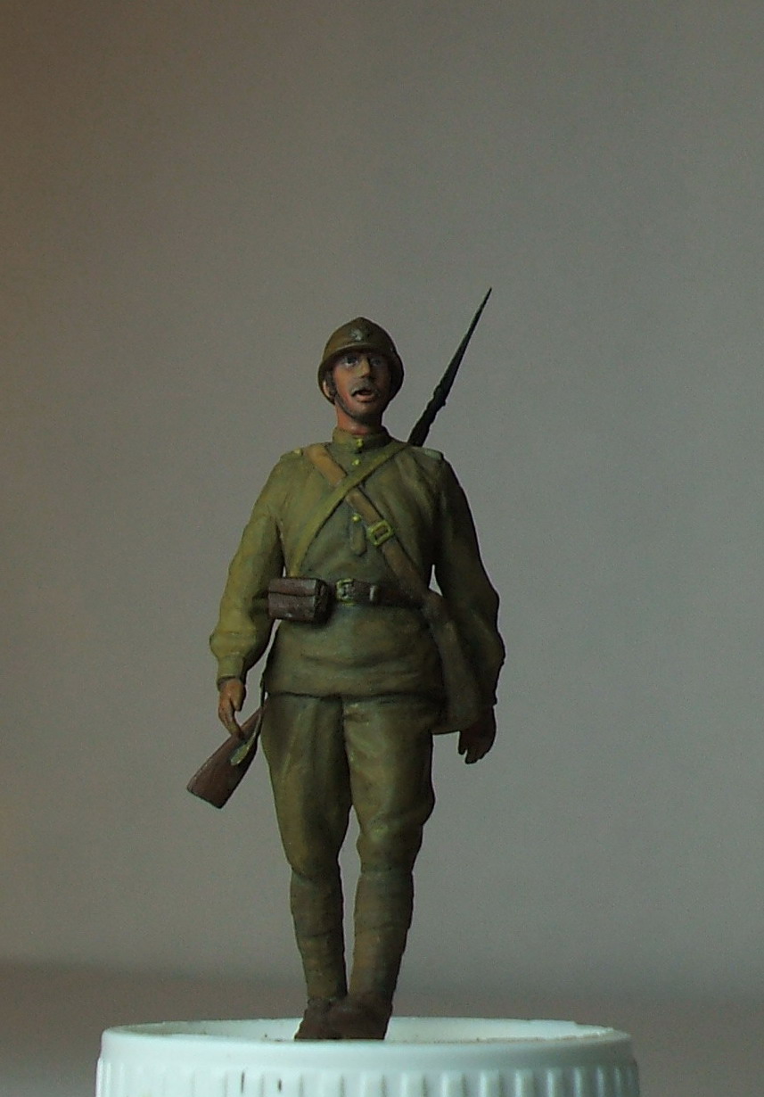 Здравствуйте уважаемые коллеги! Выставляю на суд свою последнюю работу. Это небольшая конверсия миниартовского пехотинца, из знаменитого набора советской пехоты на марше. У данной фигуры была заменена голова(Хорнетовские французы), немного переделана сумка, заменена винтовка и добавлена лопатка. Самым сложным, было вылепить орла на каске адриана! Красил ПВА темперой и акриловым лаком (ремень, каска, винтовка). Получился пехотинец, где-то на период весны-лета 1917 года. В дальнейшем планирую переделать все остальные фигуры из набора, и использовать в одной композиции на диораме! Вам судить, как всё получилось. Стоит ли продолжать?