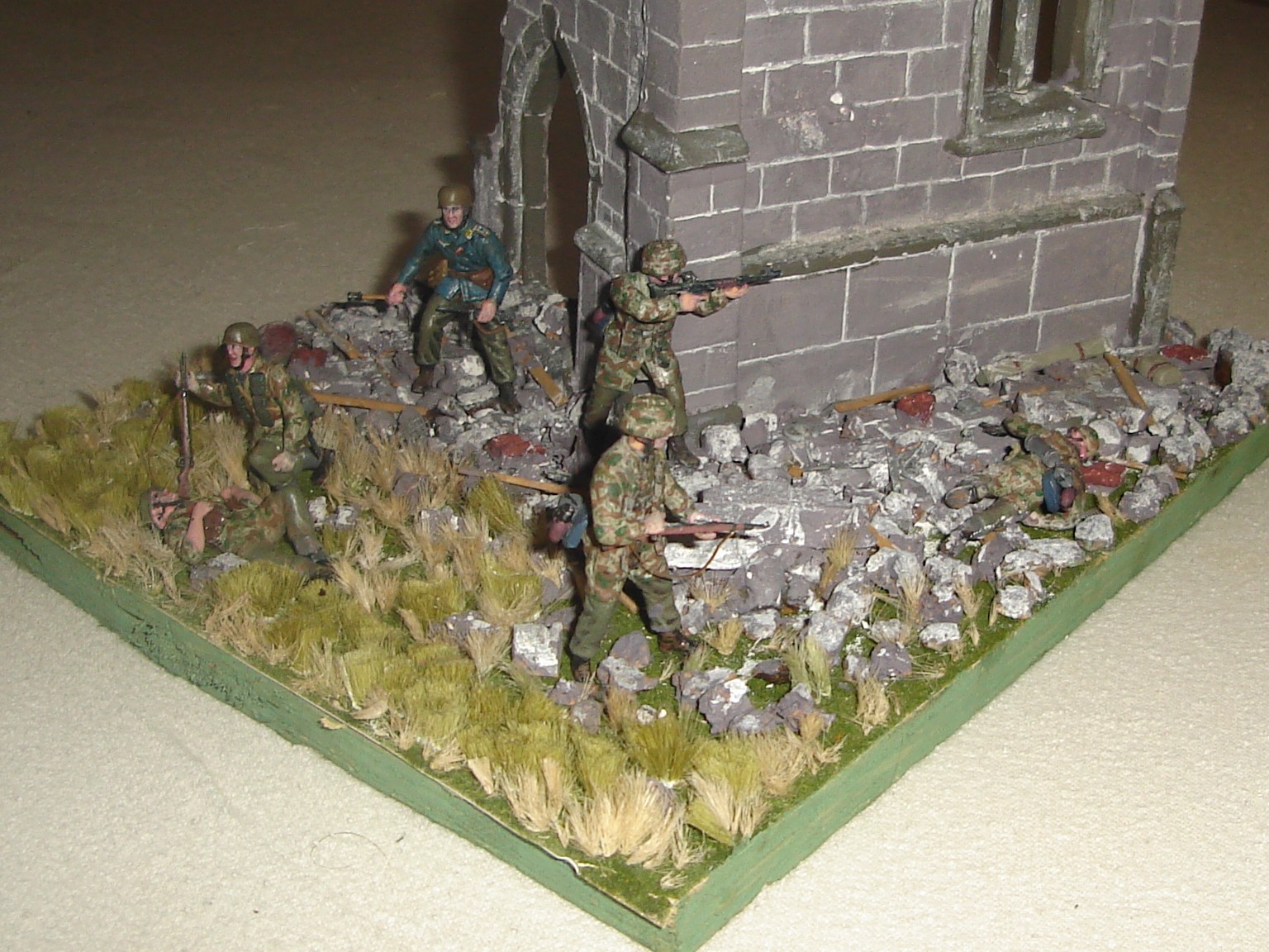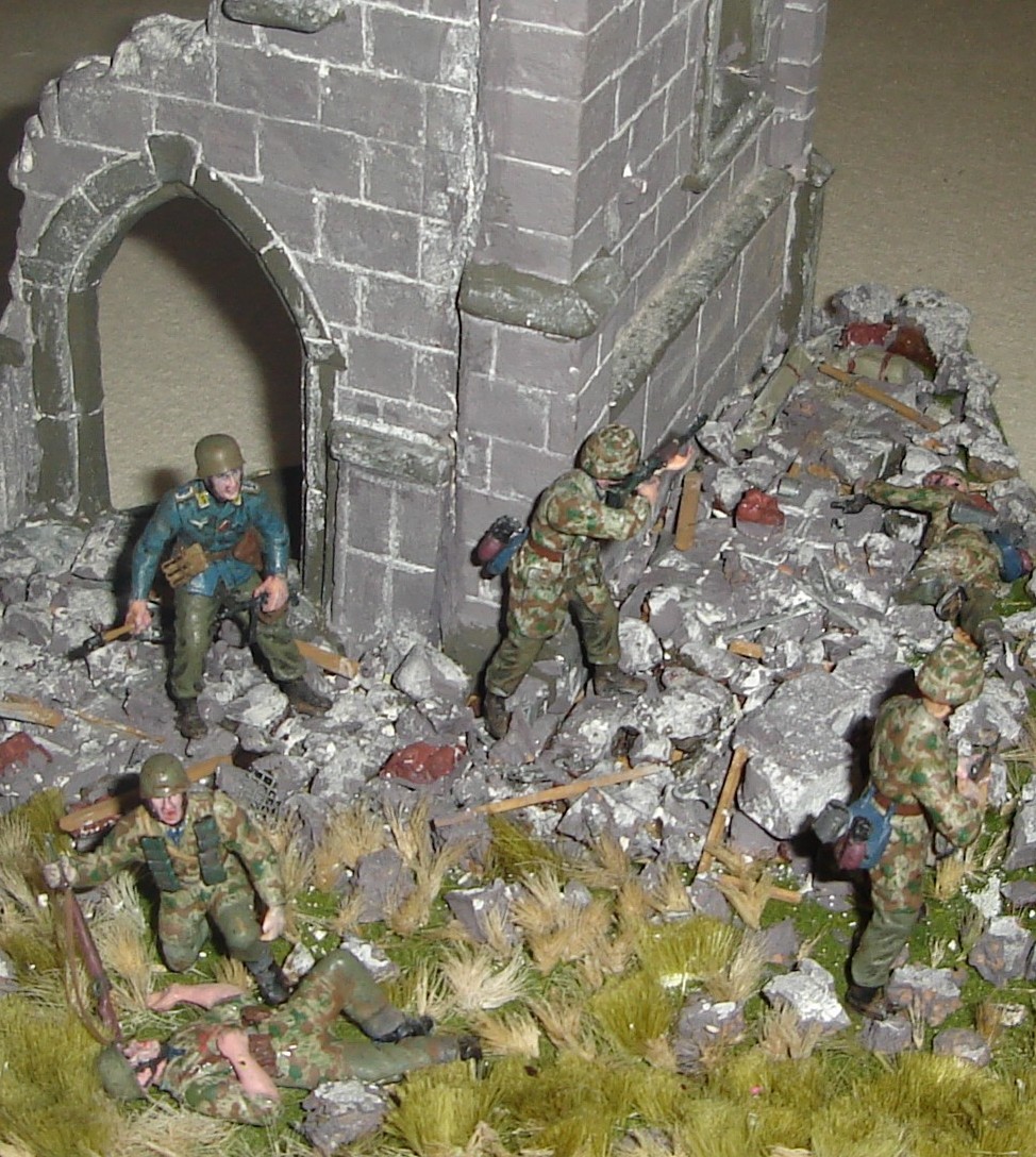 1-е отталкивает блеск фигур.. над окраской руин так же надо поработать... нем. с гранатой там не в тему и держащийся за ногу тоже..