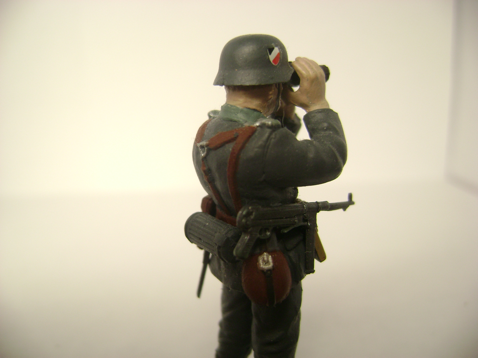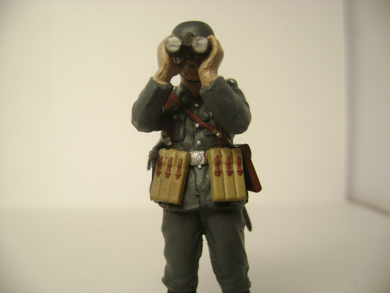 Для первой работы достаточно хорошо. Из того, над чем вам следует поработать в ближайшее время - обязательно зачищайте швы от стыков пресс-форм на деталях(они у вас и на противогазной коробке, и на фляге, и на сапогах); учитесь класть краску тонким слоем. Бинокль можно высверлить и залить стекла глянцевым лаком. Ну и стараться прописывать мелочи (канты, петлицы, пряжки и т.п.) - сразу не придет, тут только практика. Удачи!