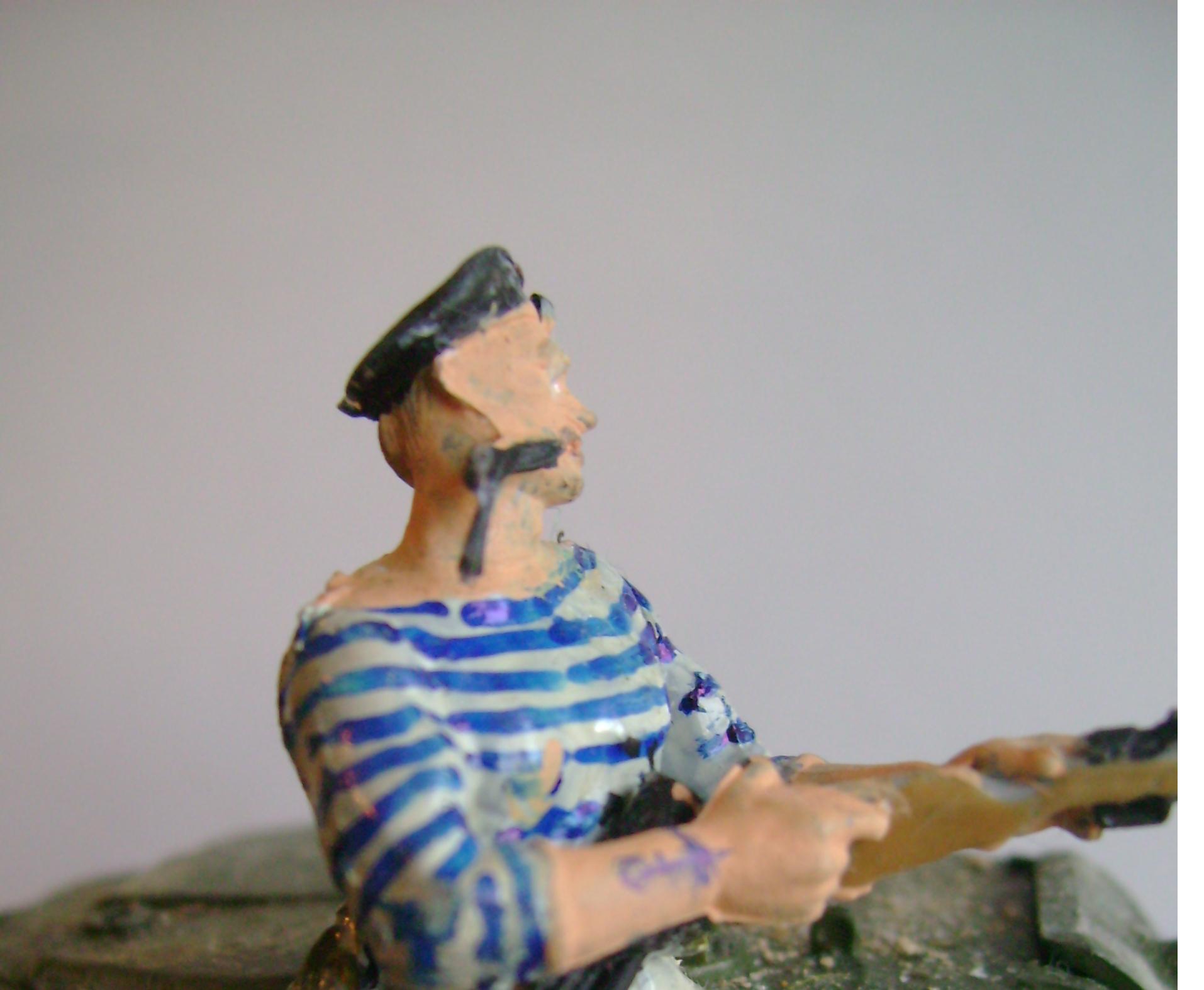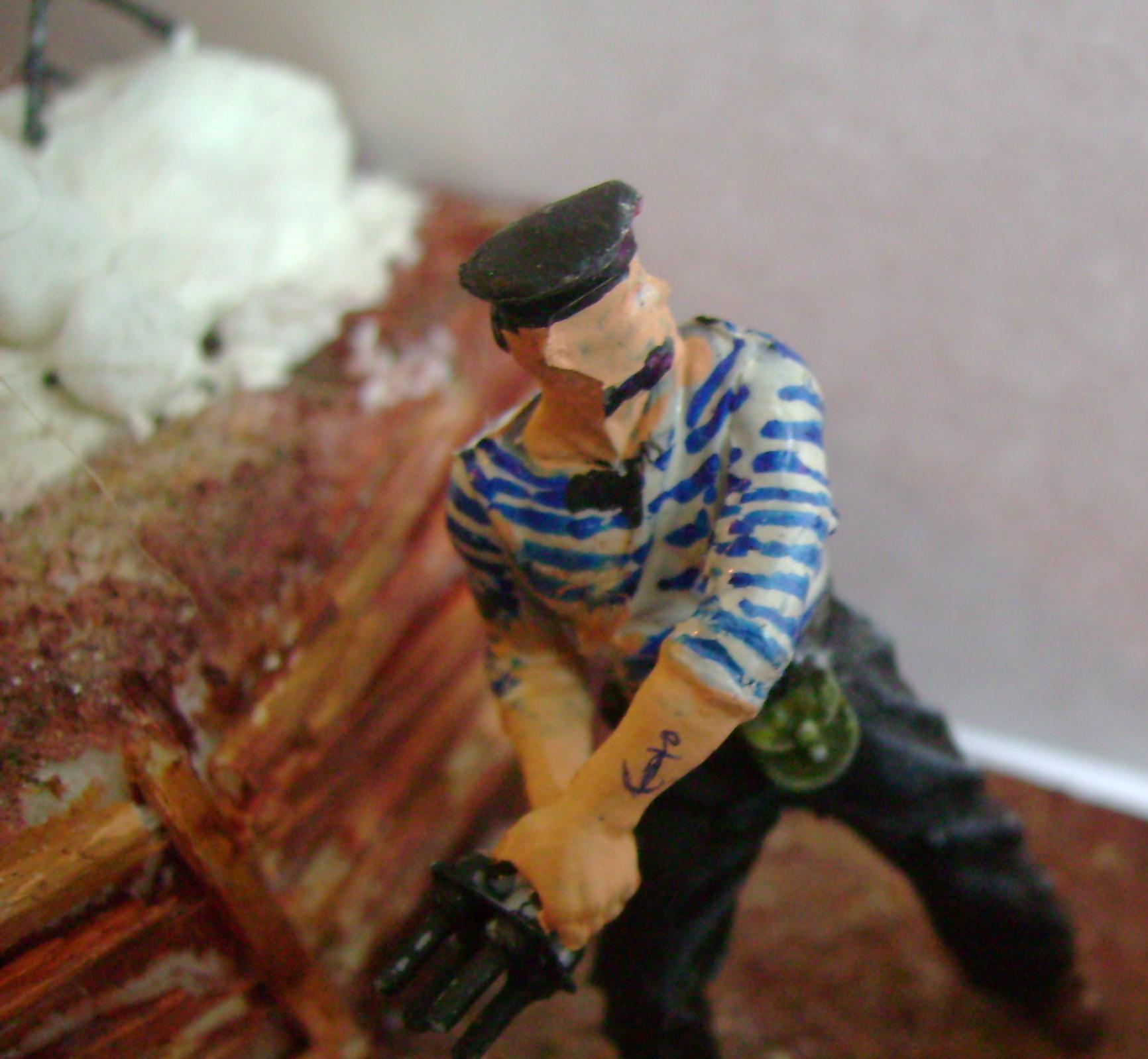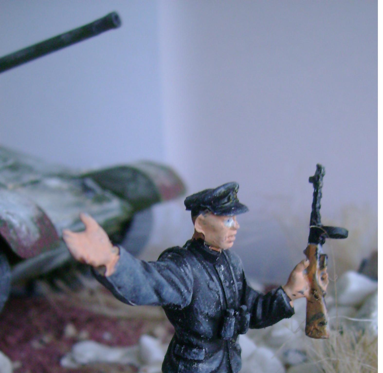 М-дя, вя работа - сплошной недочёт. Прежде всего, по аккуратности покраски и сборки фигурок. Зачем было рисовать глаза, если они такие большие получились - проще было их закрасить. Про швы Дима уже сказал. И изначально более детально продумывайте композицию - непонятно, что делает этот ползущий в окопе, когда все стреляют. Моряк на броне - тоже ни к селу ни к городу - в полный рост его первая пуля поймает. зачем на танке на решётке МТО камень: как он туда попал вообще? Китель и бинокль на офицере не могут быть одного цвета.