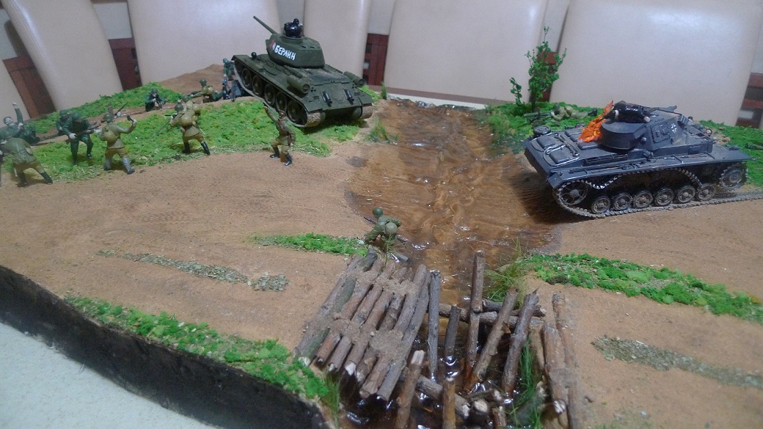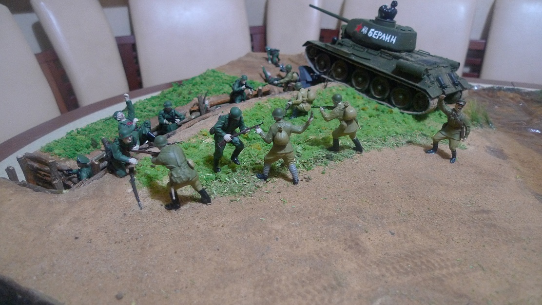 Фигурки - разные: ЗИС-3 с расчетом Миниарт, немецкий танк - Тамия, русские солдаты и Т-34 - Звезда, немцы - звезда и какие-то "вражеские", не помню.