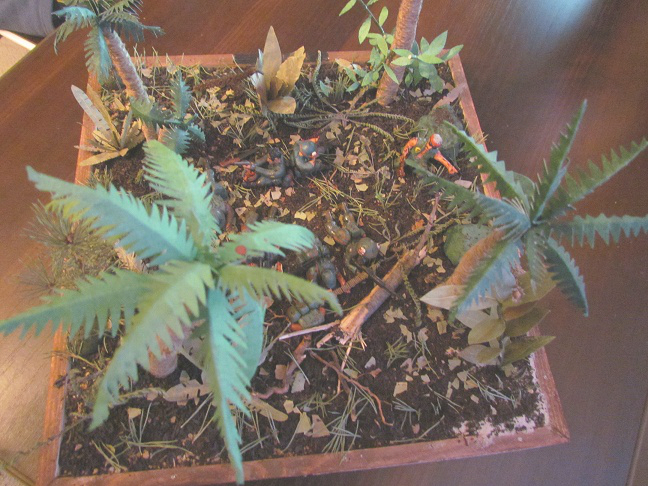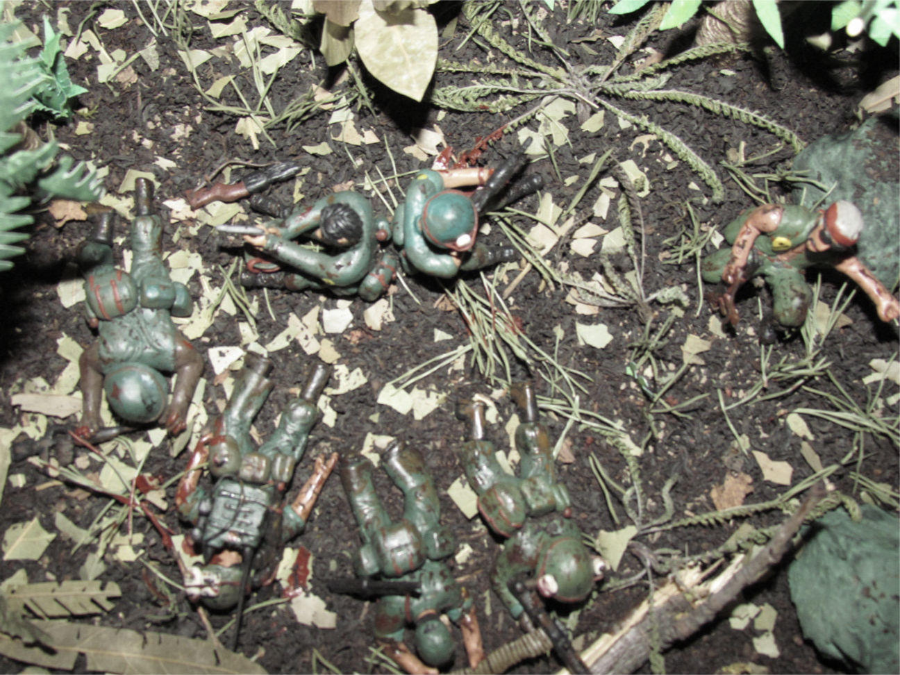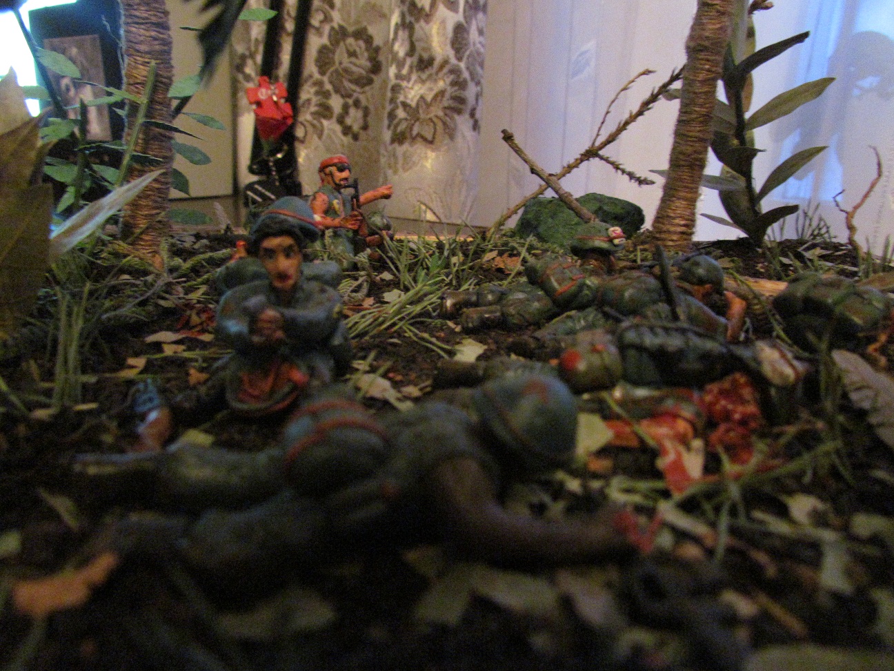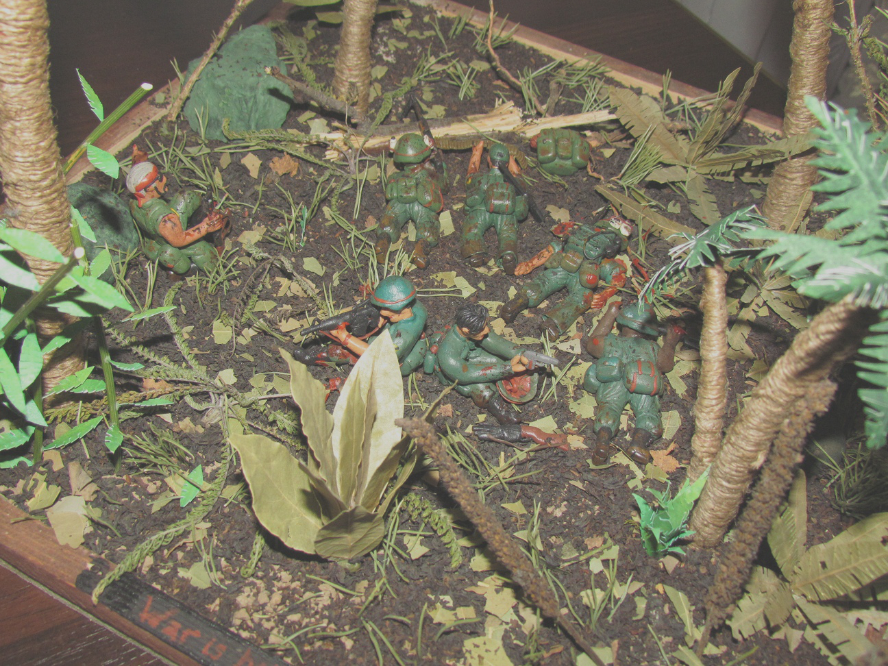 Лепил просто из обычного детского пластилина. Основание сделано из пластинок ДСП, засыпал чёрным чаем, лаврушкой, сухой листвой, немного мха. Пальмы из мешочных ниток. На создание диорамы толкнул фильм " Мы были солдатами"Сюжет: Дождь, грязь, назойливые насекомые, усталость, дырявые сапоги. Идёт взвод "Американских мальчиков" и штатов Техас, Канзас, курят,смеются разговаривают. И тут выстрел... Билли упал замертво, и сразу автоматные очереди со всех сторон, крики Вьетнамцев, взрывы, обстрел такой, что невозможно поднять голову. Все разом упали в грязь, казнив при этом своё оружие. Командир понимает, что взводу приходит конец, взвод окружён. При детальном рассмотре диорамы, становится ясно, что действительно, приблизительно через 5 минут, не останется никого...