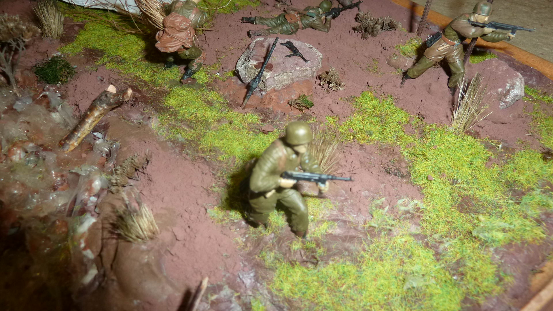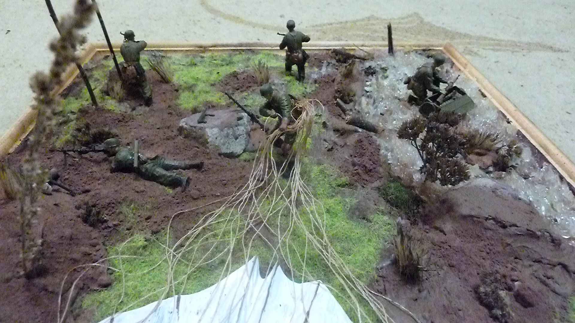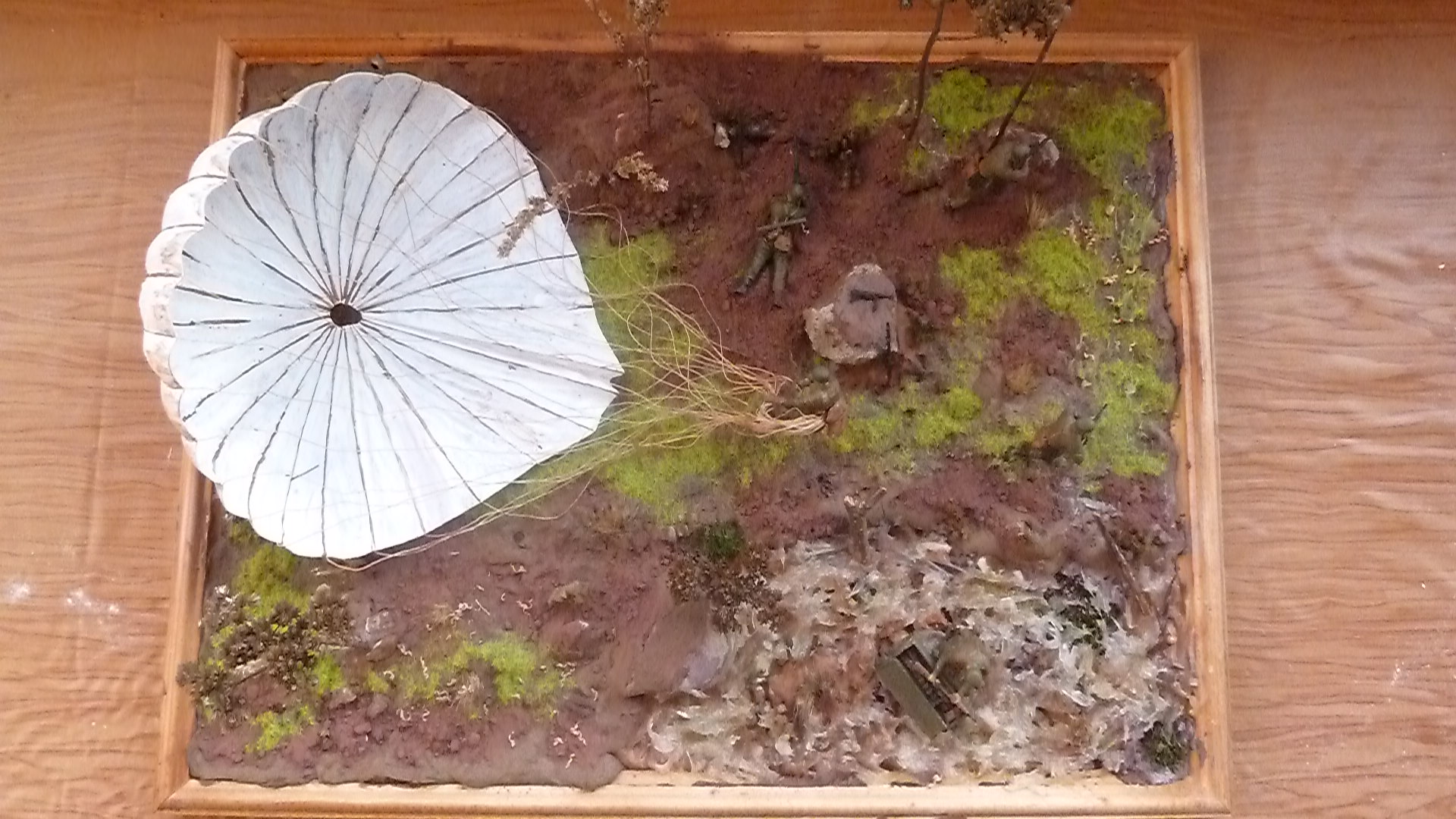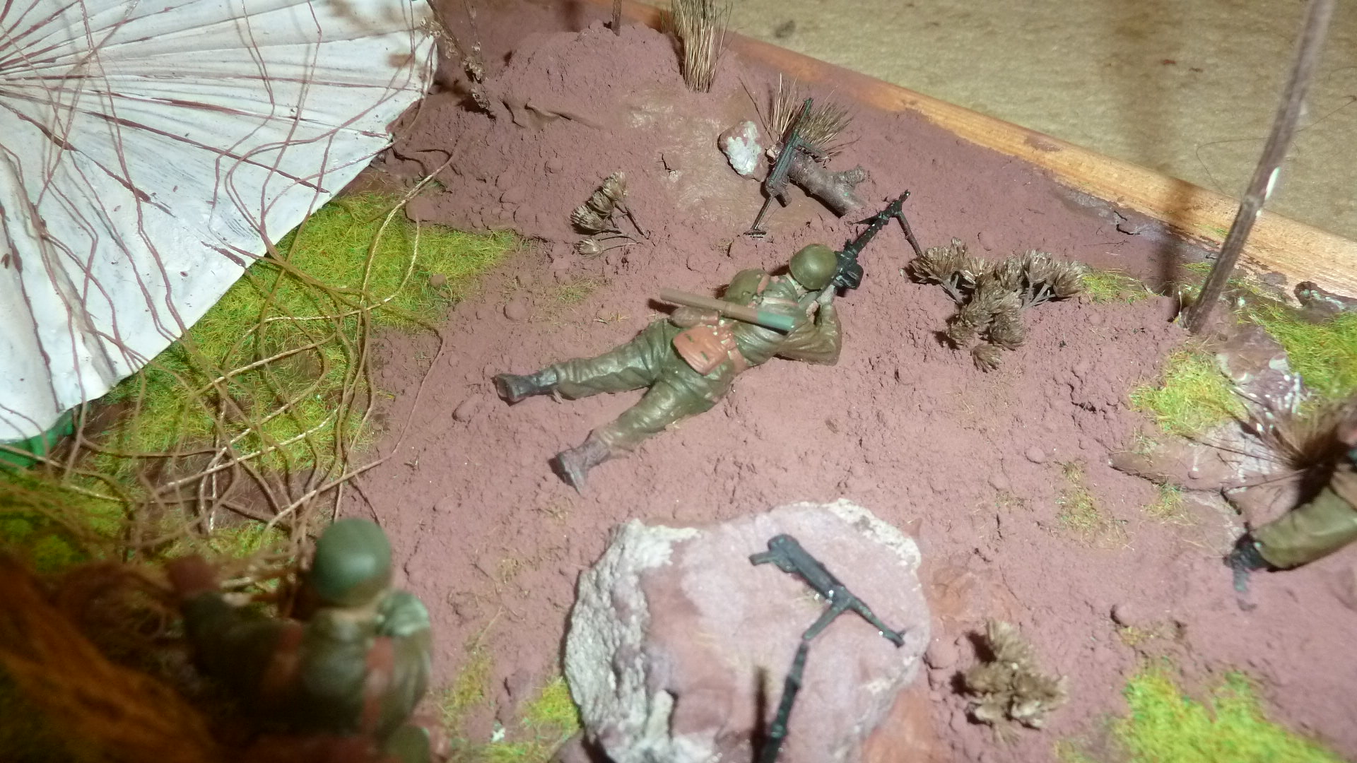 В работе представлен набор фирмы ЗВЕЗДА. (пришлось повозиться с парашютом) основание окрашенный гипс, трава фирма ЗВЕЗДА, ручей герметик прозрачный, деревья обычная трава (можно найти в лесу) высокая трава - кисть. Красил всё Звездовскими красками.(ни ка не могу снять фигуры без блеска).