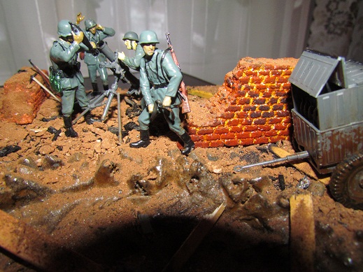 Использовал Набор немецких миномётчиков от "Звезды", самоходка от фирмы "ark models". Самоходку собрал ещё в глубоком детстве и разумеется успел много раз сломать, но когда стал подумывать о диораме, то пришлось восстанавливать её почти с нуля, а именно: заменил гусеницы, броневые листы, ствол пушки. Краски: ржавчина от "Звезды", местами обычная акварель , форма солдат- машинная грунтовка. Основание сделано из простой коробки, воронка- пенопласт, залитый клеем пва с содой и песком, развалины- ренопласт, местами брусчаска из скульптурного пластилина, мусор- крошка кирпича, палочки из под эскимо.