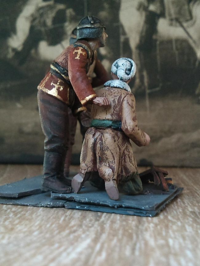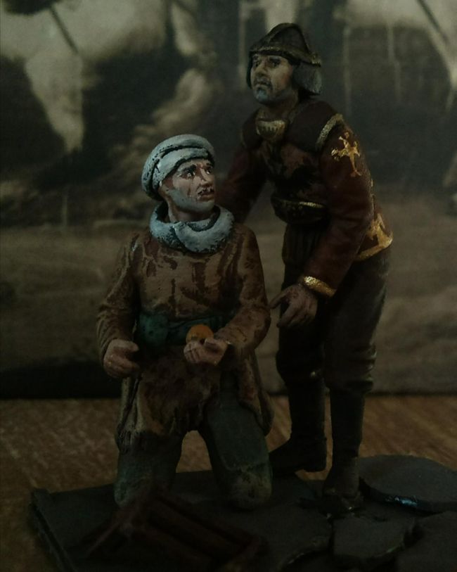 Здравствуйте. Вот я и решился выставить свою небольшую (вру- меньше!) виньетку. Сюжет прост, но добр: Византийский торговец, возвращаясь с рынка, споткнулся и упал, при этом разбив ящик с оставшимися апельсинами. Два стратиота (византийское ополчение), патрулируя квартал, увидели это и решили помочь. Пока один из них, стражник с одним глазом, разгоняет толпу зевак, другой помогает торговцу подняться. Все фигуры конверсионные, окрашены темперой и акрилом Тамии. Это моя первая работа на сайте, ну то есть, вообще она далеко не первая, потому я немного волнуюсь, но все равно буду рад услышать критику и советы.