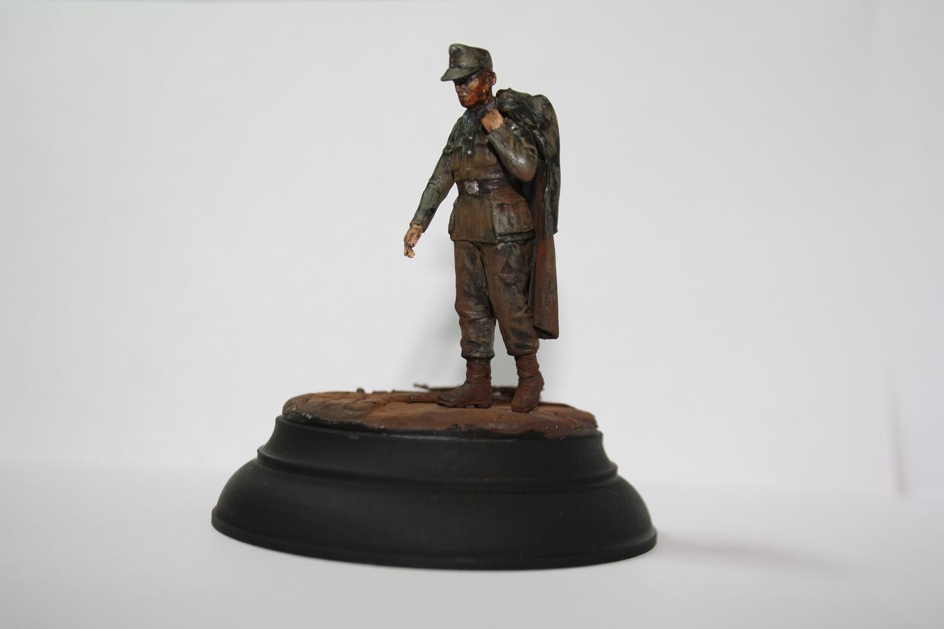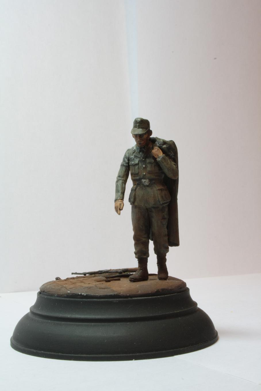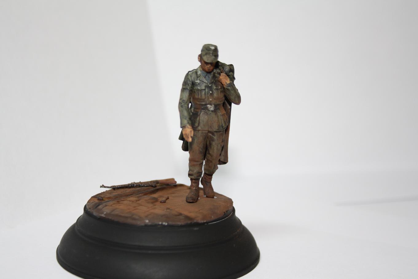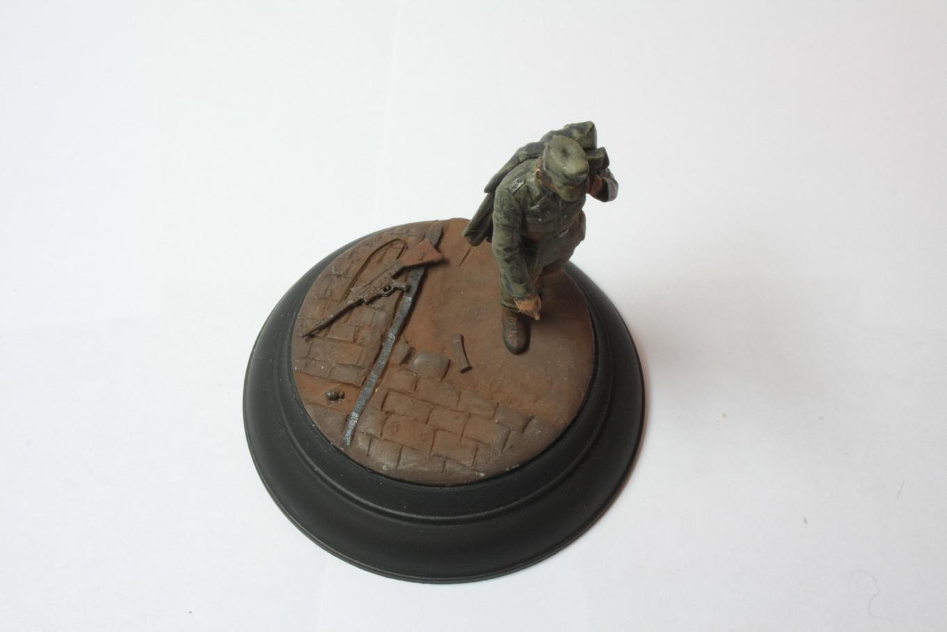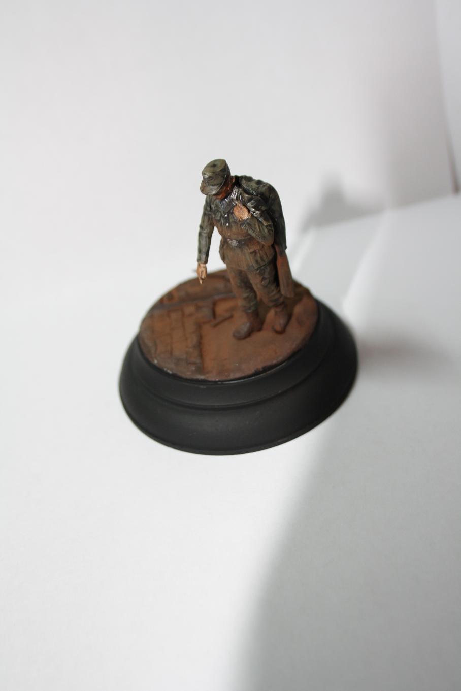 В работе использован пленный немец из МастерБоксовских пленных. Круглое основание от миниарта. STG от драгоновской генты. Брусчатка-эпоксилин. Окрашено акрилом звезда и пигментами от МастерПигмент.