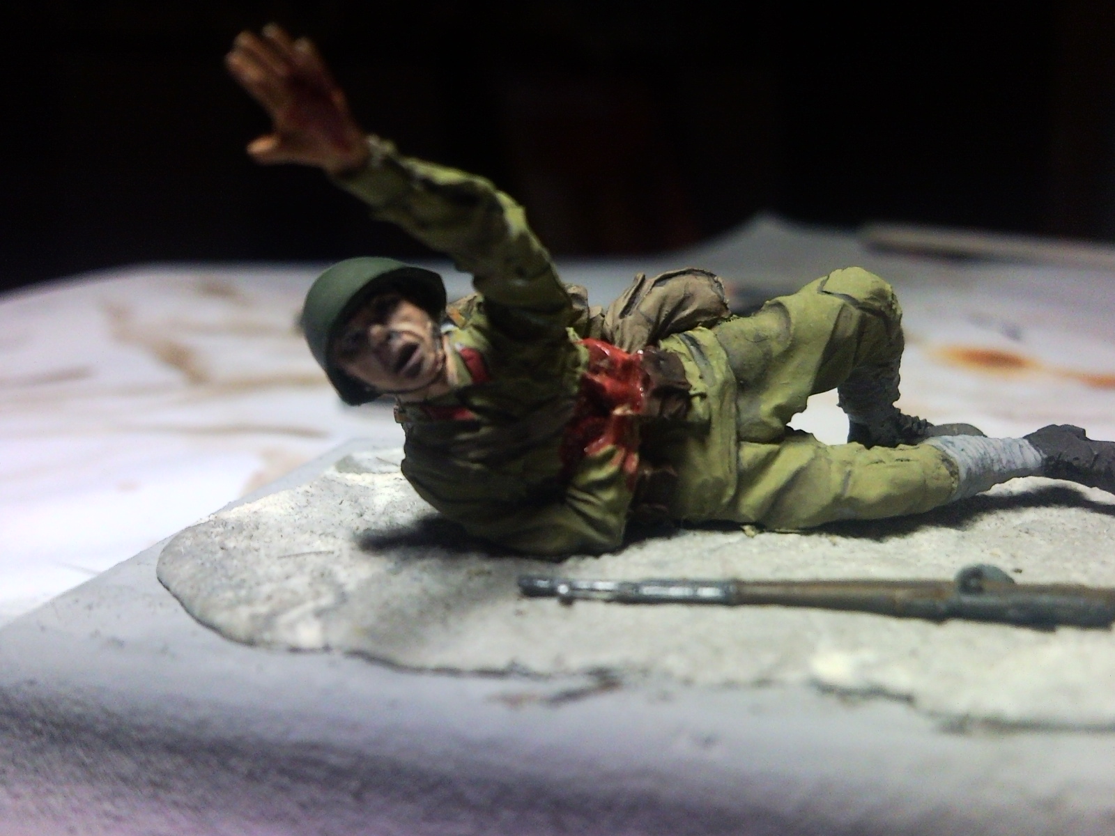 евгений965, неплохо, но есть ощущение. что перед покраской недостаточно "зачистили" фигурку.Снаряжение слишком однотонно: ранец, шинель, сумки - всё одного цвета. И не совсем понятно на чём лежит раненый. Но общее направление очень понравилось: присоединюсь к Семену ванову!