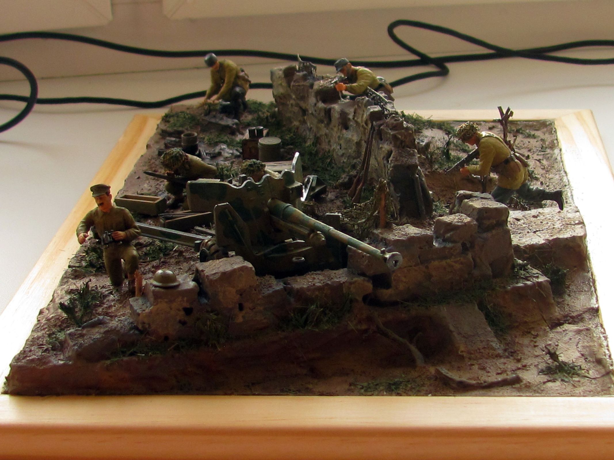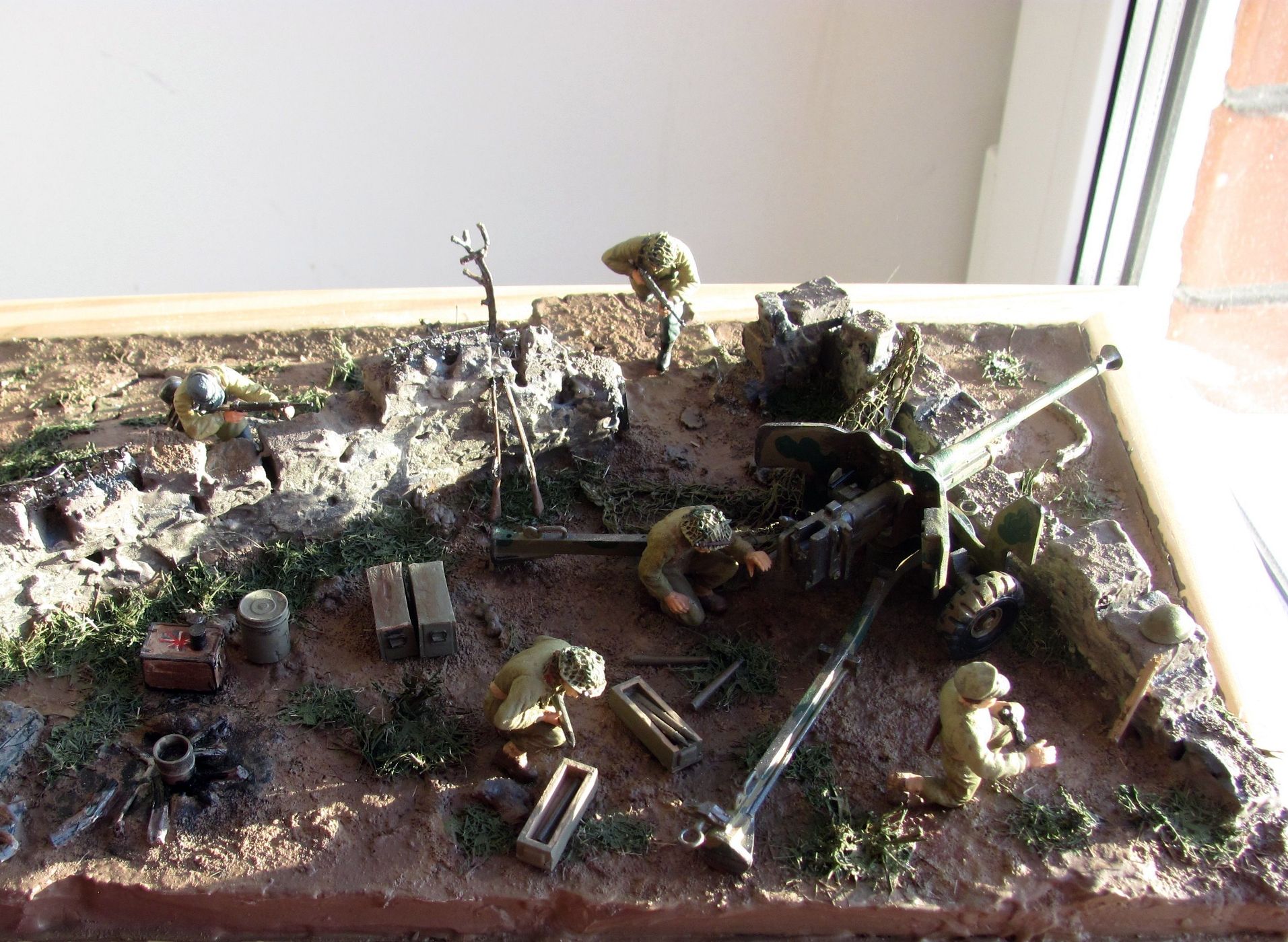 При изготовлении работ с использованием арт. установок учитывайте, что орудие у Вас установлено не на бетоне (при стрельбе на грунте остаются характерные следы от колёс и упоров). Кроме того, имеющие мозги артиллеристы никогда не оставят маск. сеть на подвижных частях, тем более одной стороной зацепившуюся за неподвижный объект (у Вас, кажется, из стены торчит арматура), это чревато неприятными последствиями.