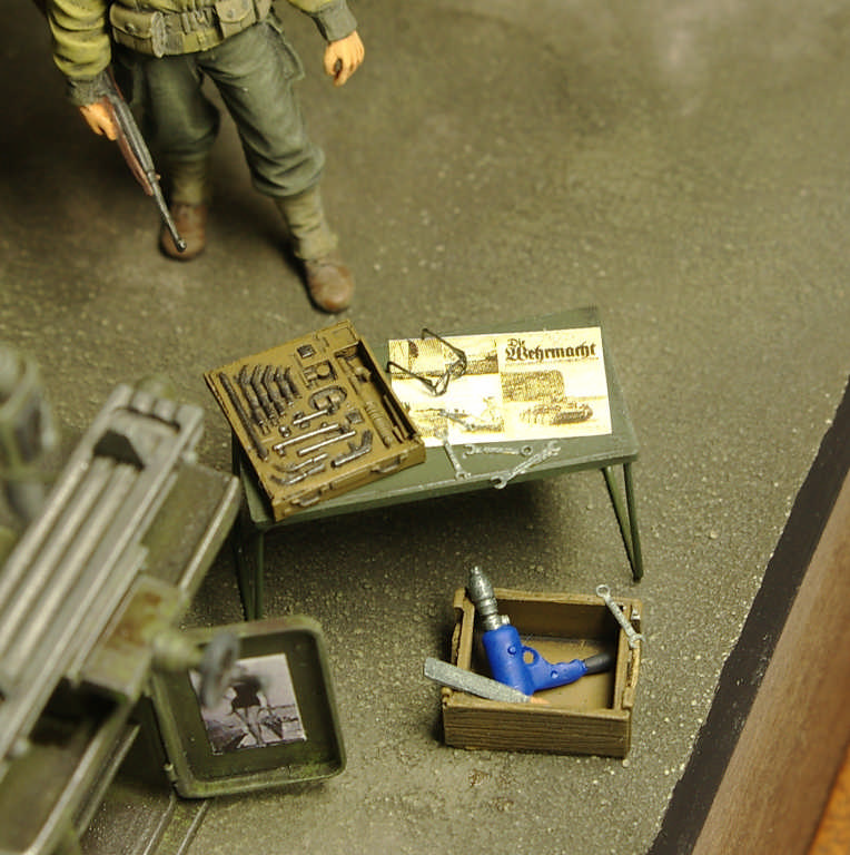 Хорошая качественная работа. А вот с сюжетом действительно проблемка: на стоящем немце приколота записка для отправки в госпиталь, так что врядли они линять куда-то собирались... Еще сомневаюсь чтобы танкист носил флягу на поясе, опасно знаете ли....