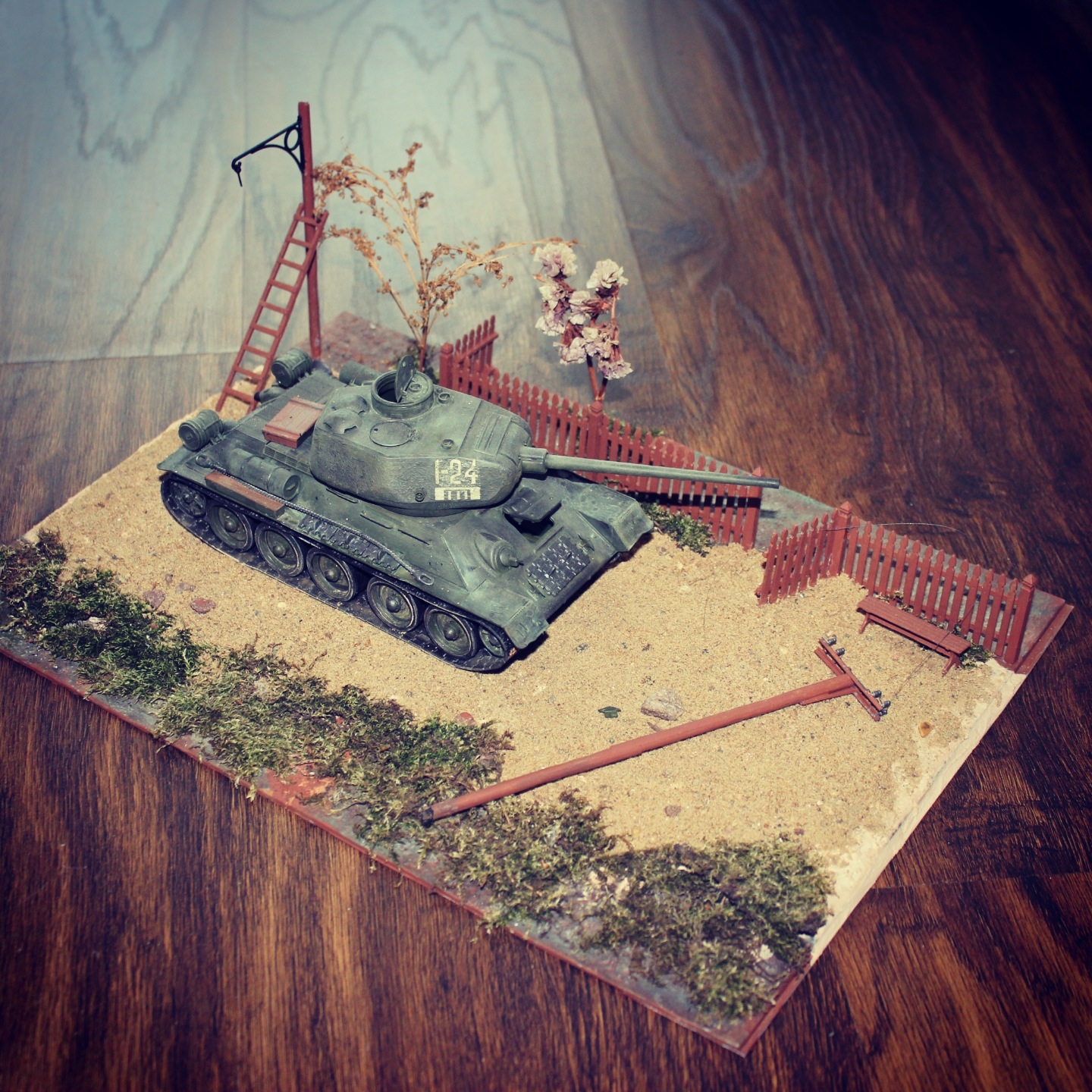 Привет всем! Первая диорама сделана полгода назад, т-34 от Звезды, основание от Миниарт, земля-песок и затирка для плитки, трава -мох, деревья- верхушки от кустов красил кистью,диораму забросил потом реанимировал, вот что получилось. Занимаюсь моделированием полгода. Пехоту не собирал боюсь опыта маловато лица не покрашу. Спасибо жду критики!