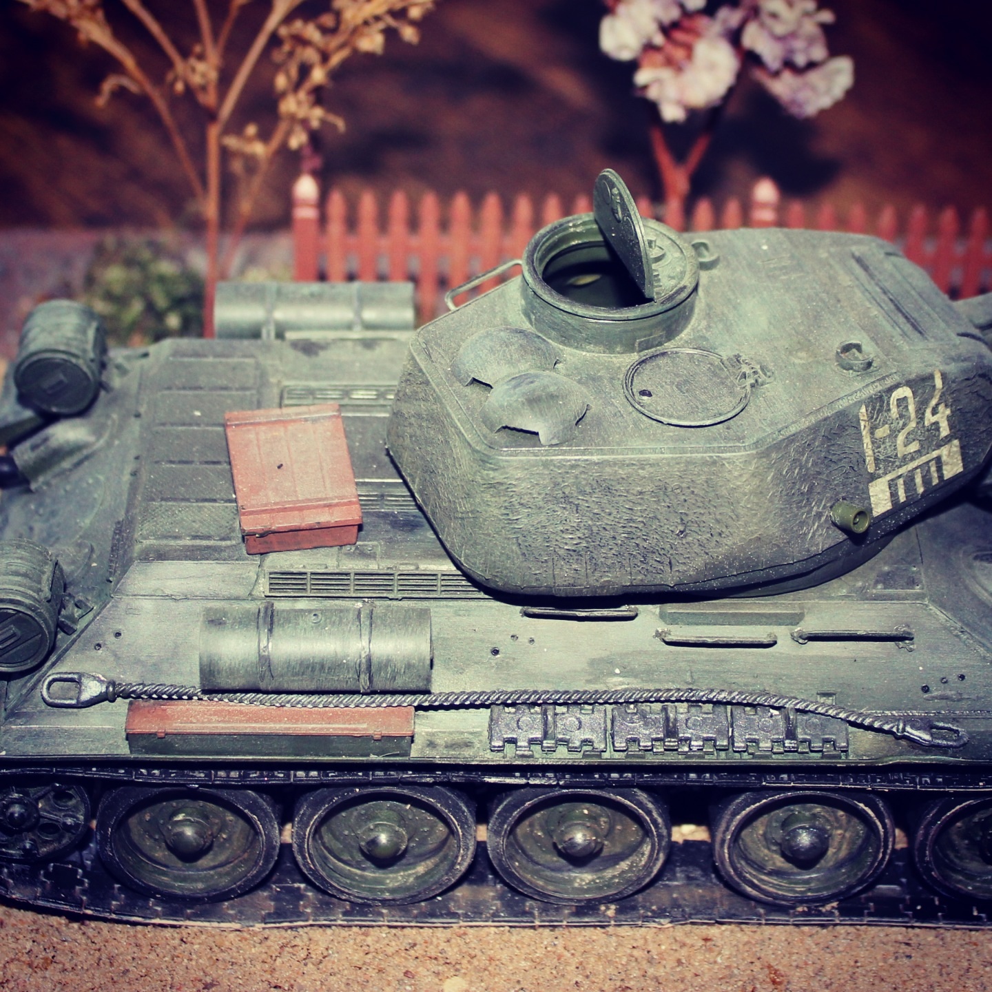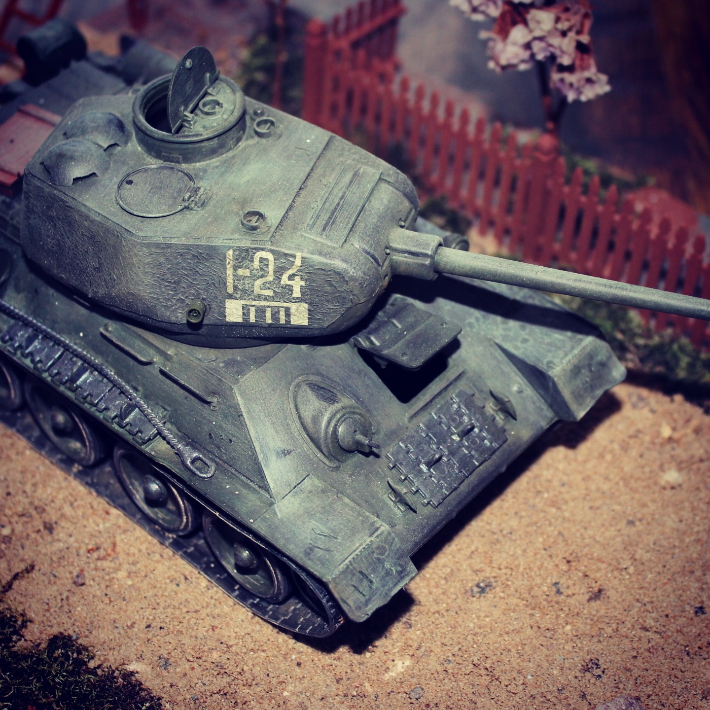 танк выглядит запылённым, а забор и столбы как только что покрашены.