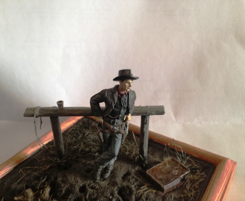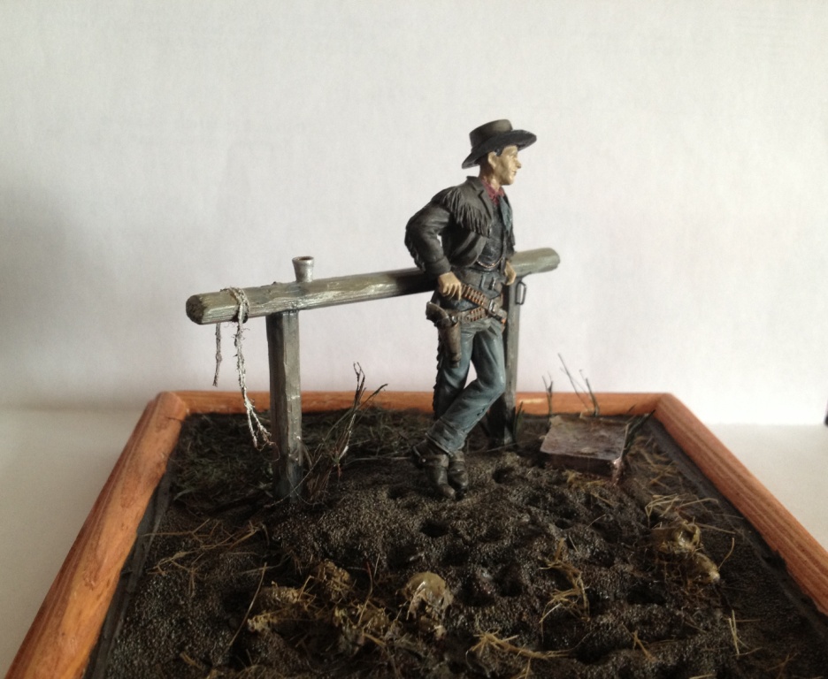 Пожалуй, любимая для меня тема - тема Дикого Запада. Ну и, увиденная случайно в магазине сборных моделей моего приятеля фигурка, напомнила о старой симпатии к жанру вестерна и сподвигла отложить на время фрицев и прочих персонажей второй мировой войны)Надеюсь, теперь не последняя моя работа в этом направлении.