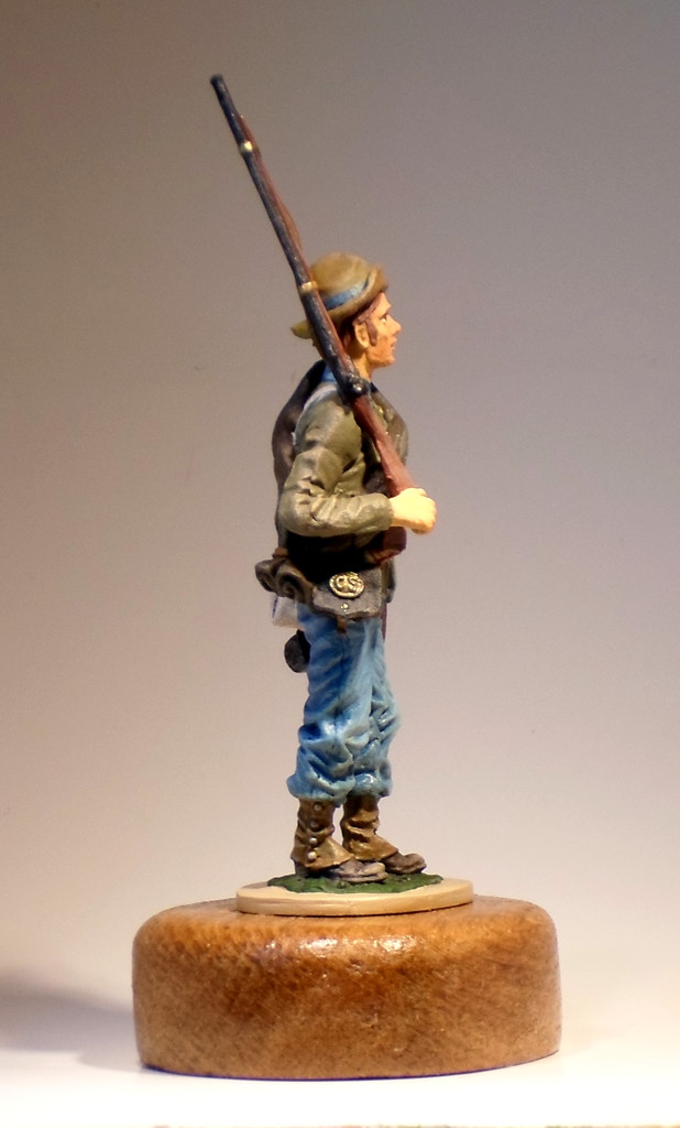Роспись понравилась, всё красиво и аккуратно. Единственно что смущает, так это цвет мундира. Синий воротник подразумевает серый окрас . Зелёный - это уже что-то своё, принесённое из дома или где-то свистнутое, а тогда воротник должен быть одного цвета с курткой (в этом случае это не мундир получается, а куртка). Персонаж получается скорее на Западный театр войны: там и снабжение похуже было, да и штаны у парня явно из запасов северян... Так что исправить воротник, что проще, и солдат Миссисипской или Теннесийской армии во всей красе!