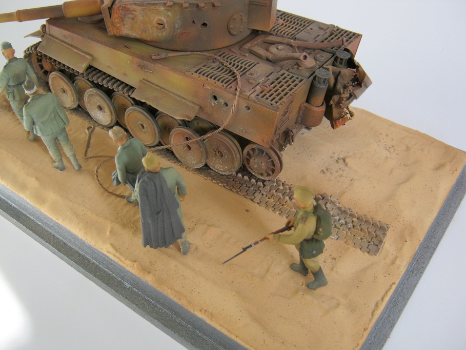 35-й массштаб, фигурки МВ, "Тигр" от "звезды". Основание гипс, песок, кошачий наполнитель. Танк достался частично собранный и некоторых деталей не доставало. Решил сделать таким. Красил нитрой "Хома", гуашь, масло.
