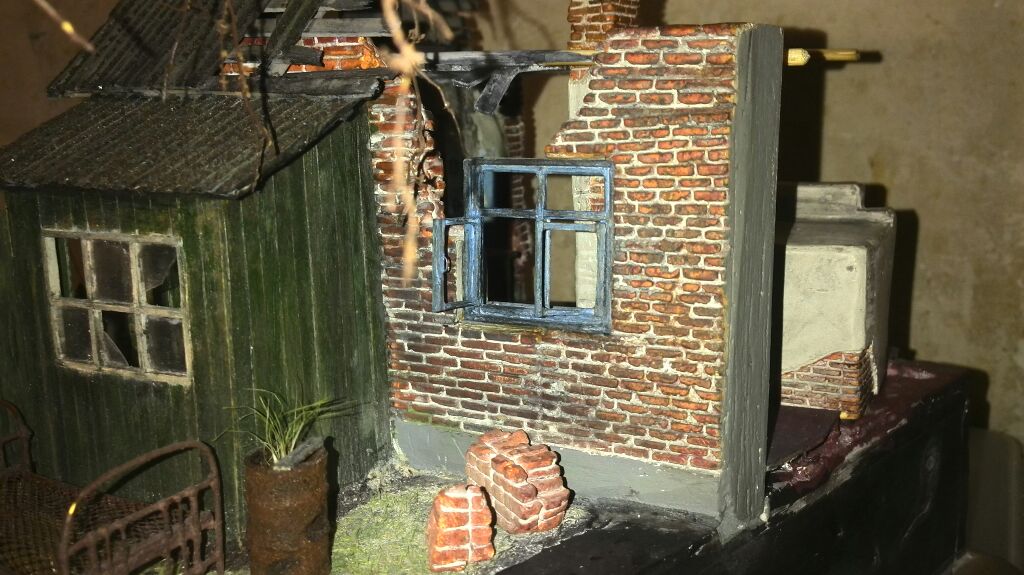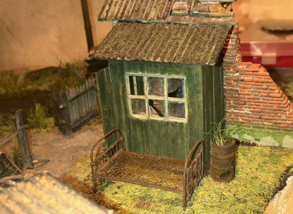 Вставил стёкла в сени и изготовил бочку. Бочку сделал в 43 масштабе. Зажал в шуруповёрте колпачёк от старого маркера, сточил о наждак до толщины бумаги, приклеил проволоку для бисера, далее покрыл клеем Акан, обсыпал содой и покрасил.