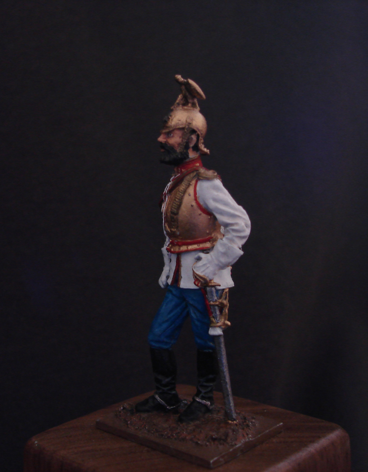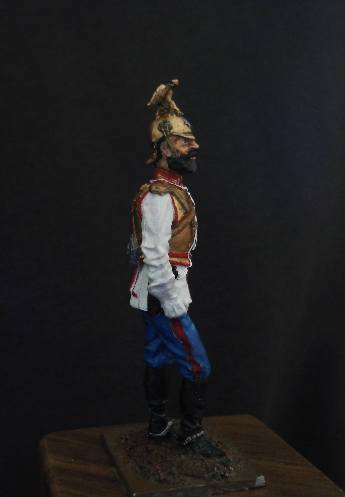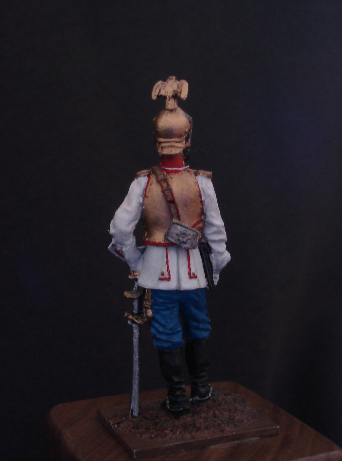Оловянная фигурка 54 мм от фирмы «EK Castings». Фигурка является офицер Лейб-гвардии Конного полка. Россия, 1883-1914 гг. В росписе использовался акрил и металики. Матовый лак я ещё не нанес. Буду рад выслушать ваши советы и мнения.