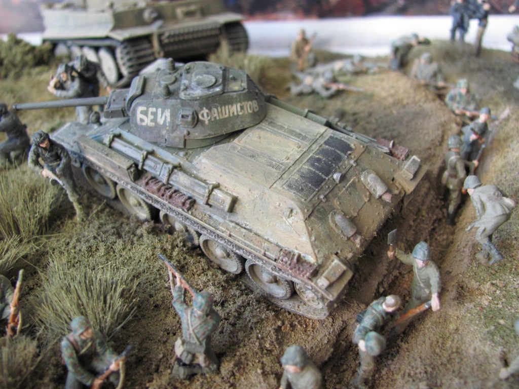 всего много а толку мало:в двух шагах друг от друга немецкая пушка и советский пулеметчик(залег), немецкие танкисты вальяжно отдыхают на броне, рукопашный бой позади тридцатьчетверки в окопе глубиной по пояс-как танк его перелетел и не подавил там никого? и подобные ляпсусы на каждом кадре. качество фигур и моделей не рассмотреть, но судя по тридцатьчетверке " бей фашистов"-не ахти.а вот на фоне всего этого основание смотрится ничего