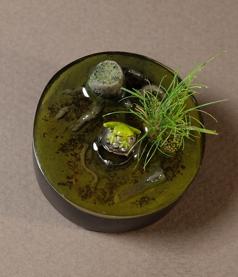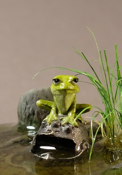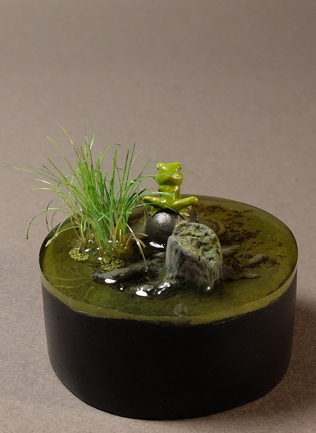 В основе смоляная фигурка лягушки на шлеме от Maow Miniatures. Дно и пень - самодел из двухкомпонентной шпатлевки. Растительность - щетина из какой-то простенькой малярной кисти. Диаметр основания 40 мм. "Вода" эпоксидная, вышла не очень удачно, но на мой взгляд приемлемо.