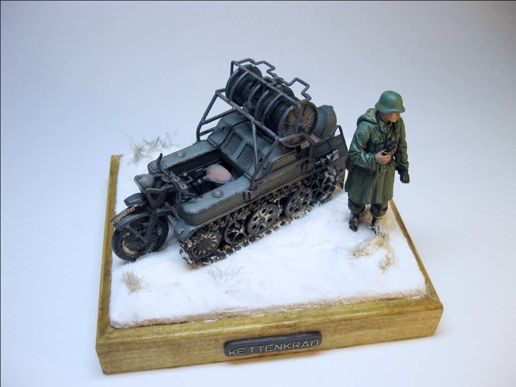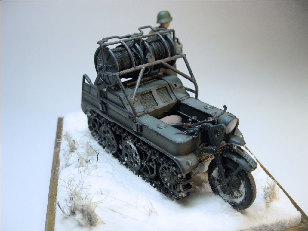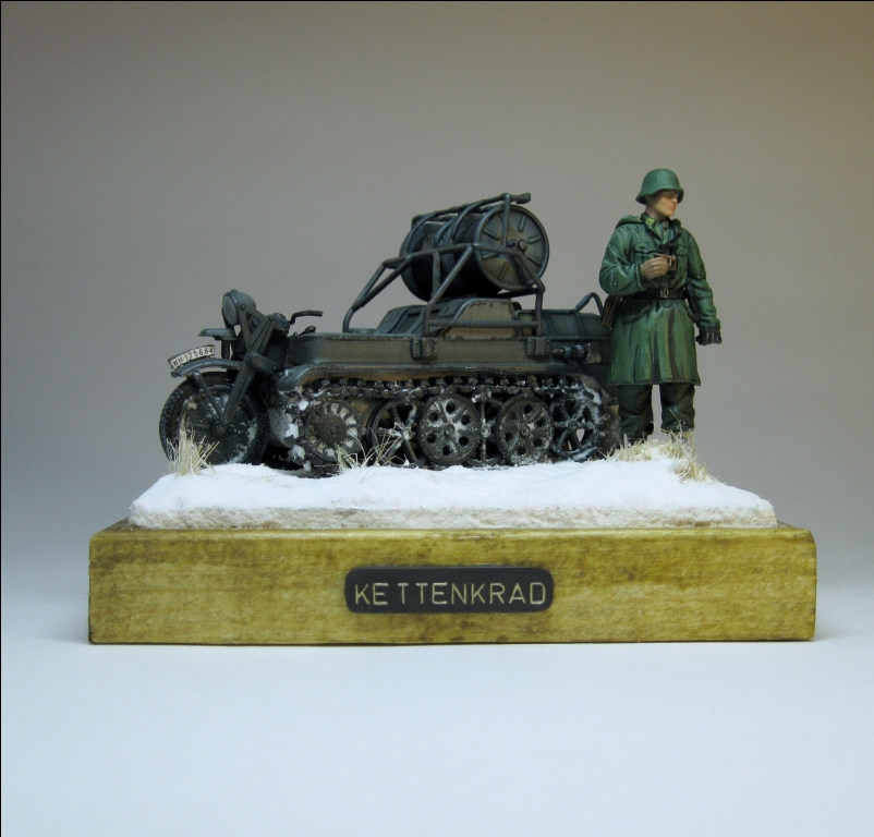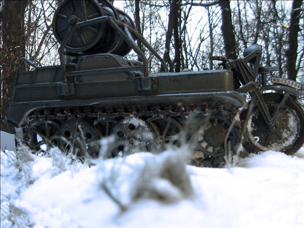 Здравствуйте друзья! Думаю, эта машина в представлении не нуждается но пару слов все же скажу. SdKfz 2 (Kettenkrad HK 101) - немецкий полугусеничный мотоцикл, разработанный в 1940 году фирмой NSU Werke и широко использовавшийся в Вермахте на протяжении всей Второй Мировой войны. SdKfz 2 нашел свое применение практически во всех родах войск (в том числе и в Люфтваффе для буксировки самолетов). Универсальное прицепное устройство давало широкие возможности и для перевозки легких орудий. Существовали также две специальные модификации -Sd.Kfz 2/1 (машина для транспортировки и укладки легкого полевого кабеля) и Sd.Kfz 2/2 (машина для транспортировки и укладки тяжелого полевого кабеля). Всего в период войны было выпущено около 9000 единиц SdKfz 2. Стоит отметить, что трофейные SdKfz 2 использовались в СССР в сельскохозяйственных целях вплоть до середины 50-х.