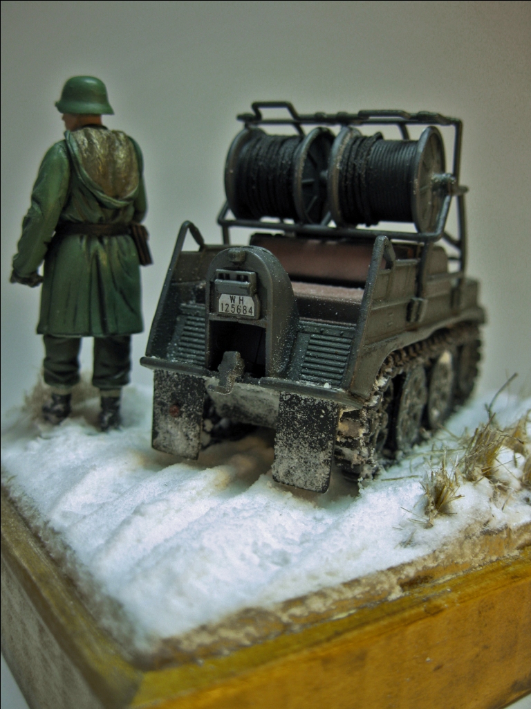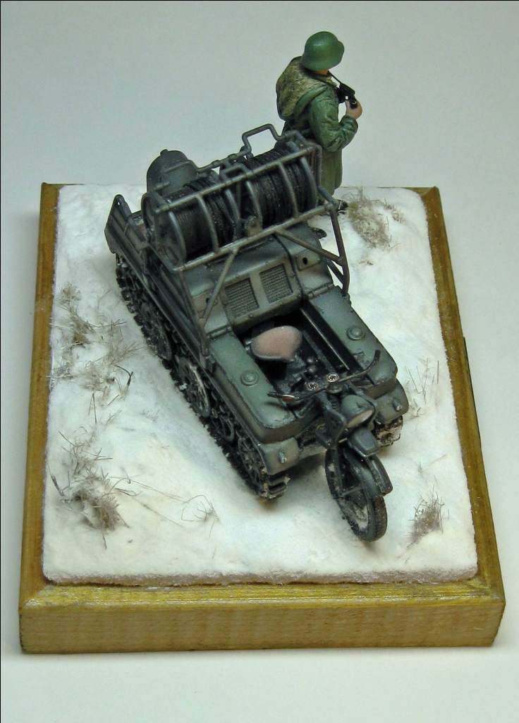Модель фирмы Dragon, собрана "из коробки". Ничего кардинально исправлять не стал, добавил лишь внутреннюю проводку, да и то только в местах, где ее видно. Коробка лежала у меня 6 лет, наткнулся разбирая старые запасы, решил все таки сделать. Окраска - акрил Тамия, визеринг - химия AK Interactive. Фигурка из набора Dragon 6144, роспись - эмаль/акрил Тамия. Снег на подставке - обработанная фиксатором для пигментов сода.