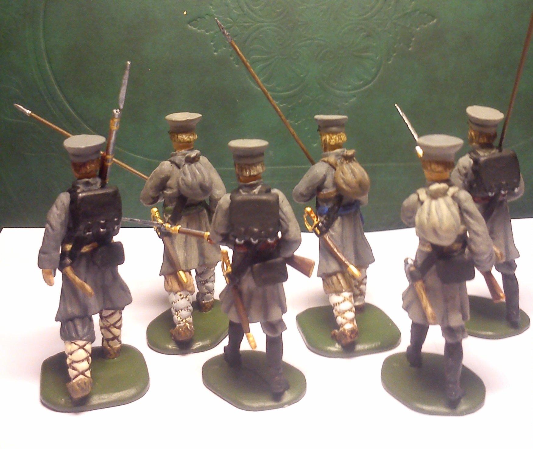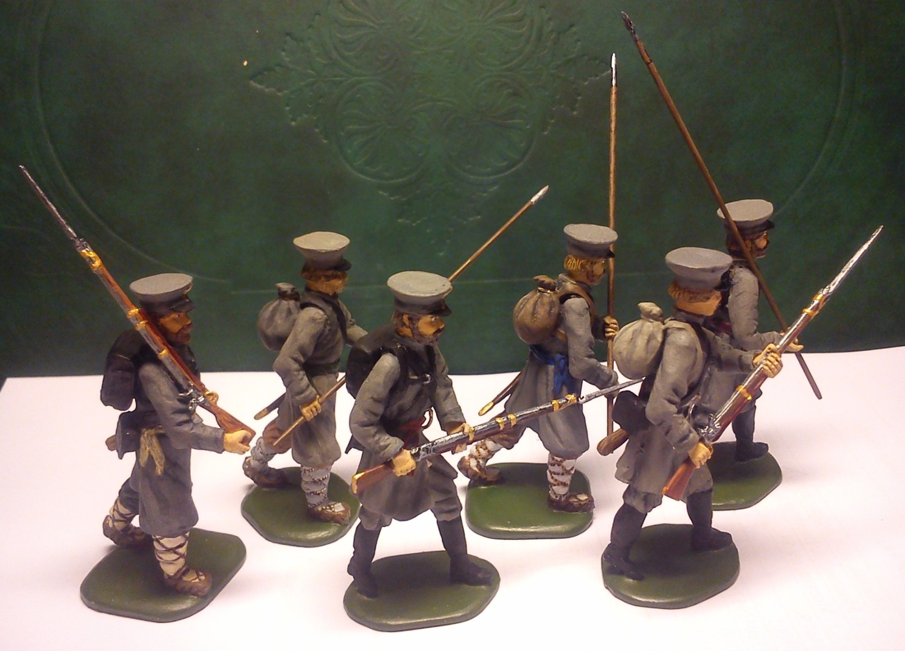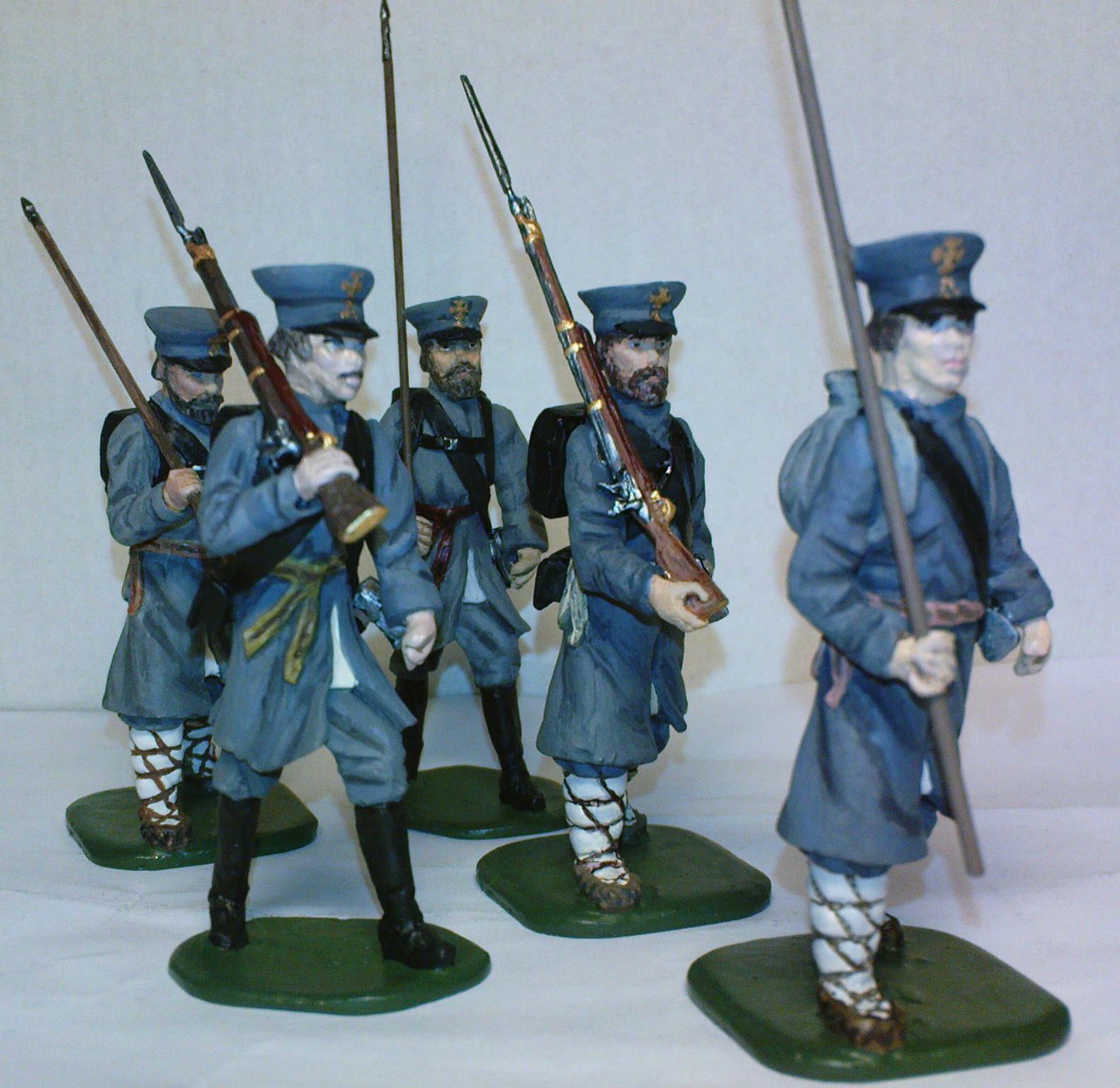 Оловянно-свинцовый сплав. Высота 54 мм (если честно – 57 мм). Мастер-модели лепились из эпоксилина. Ружье и лица сам не лепил, скопировал с купленных фигурок, добавил бороду. Краска - Звезда акрил.