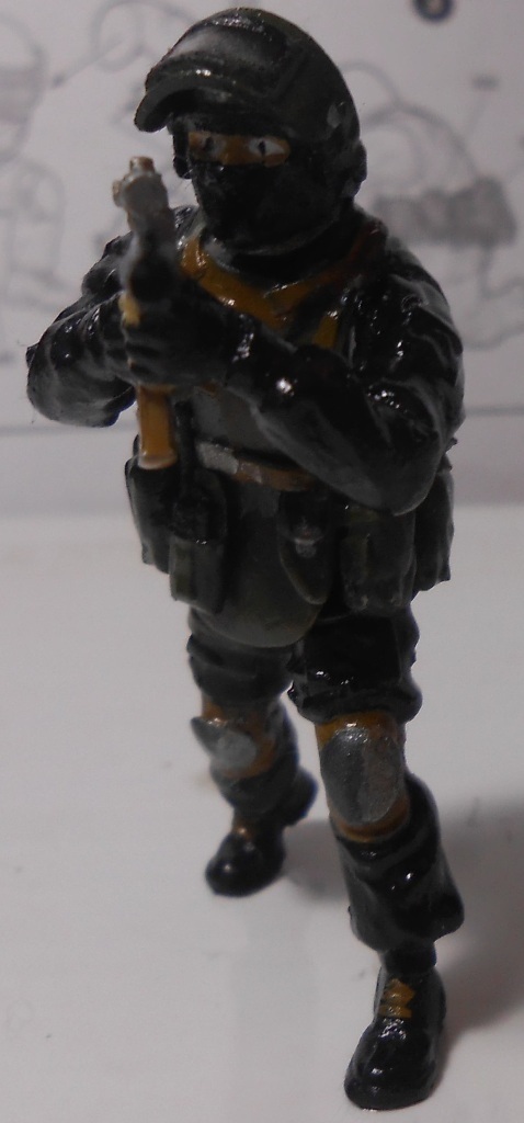 4. С черным цветом очень сложно работать, попробуйте для начала "одевать" бойцов в оливу. Если все-таки решите пробовать черную униформу, то не окрашивайте в базовый черный. Смешайте черный и светло-серый, например. Черным можно будет показывать тени в складках.