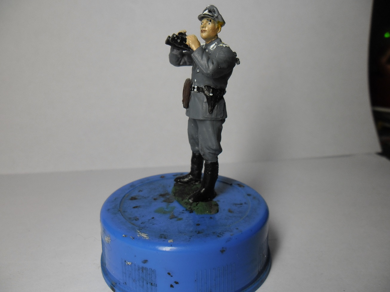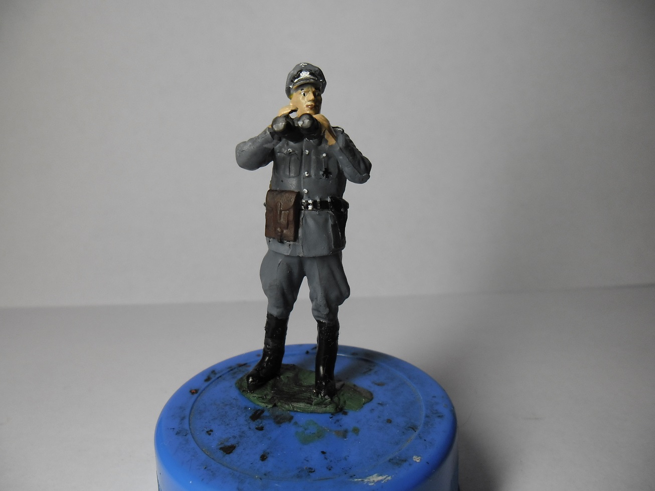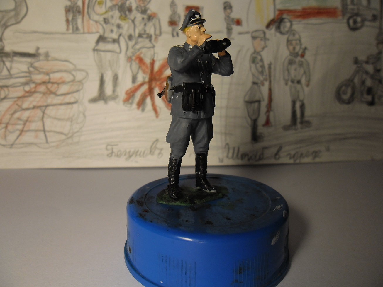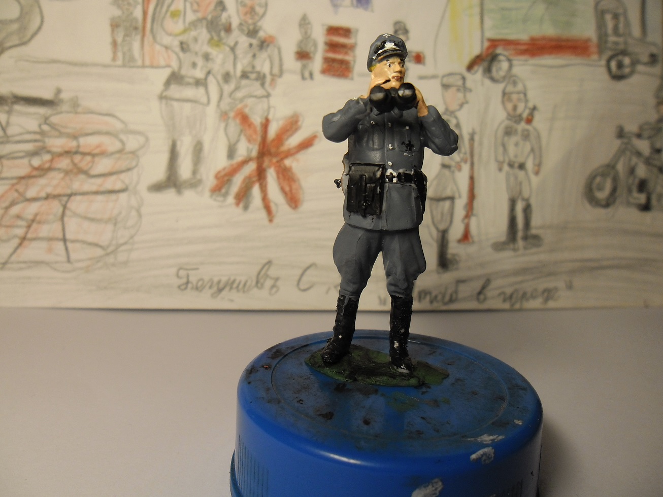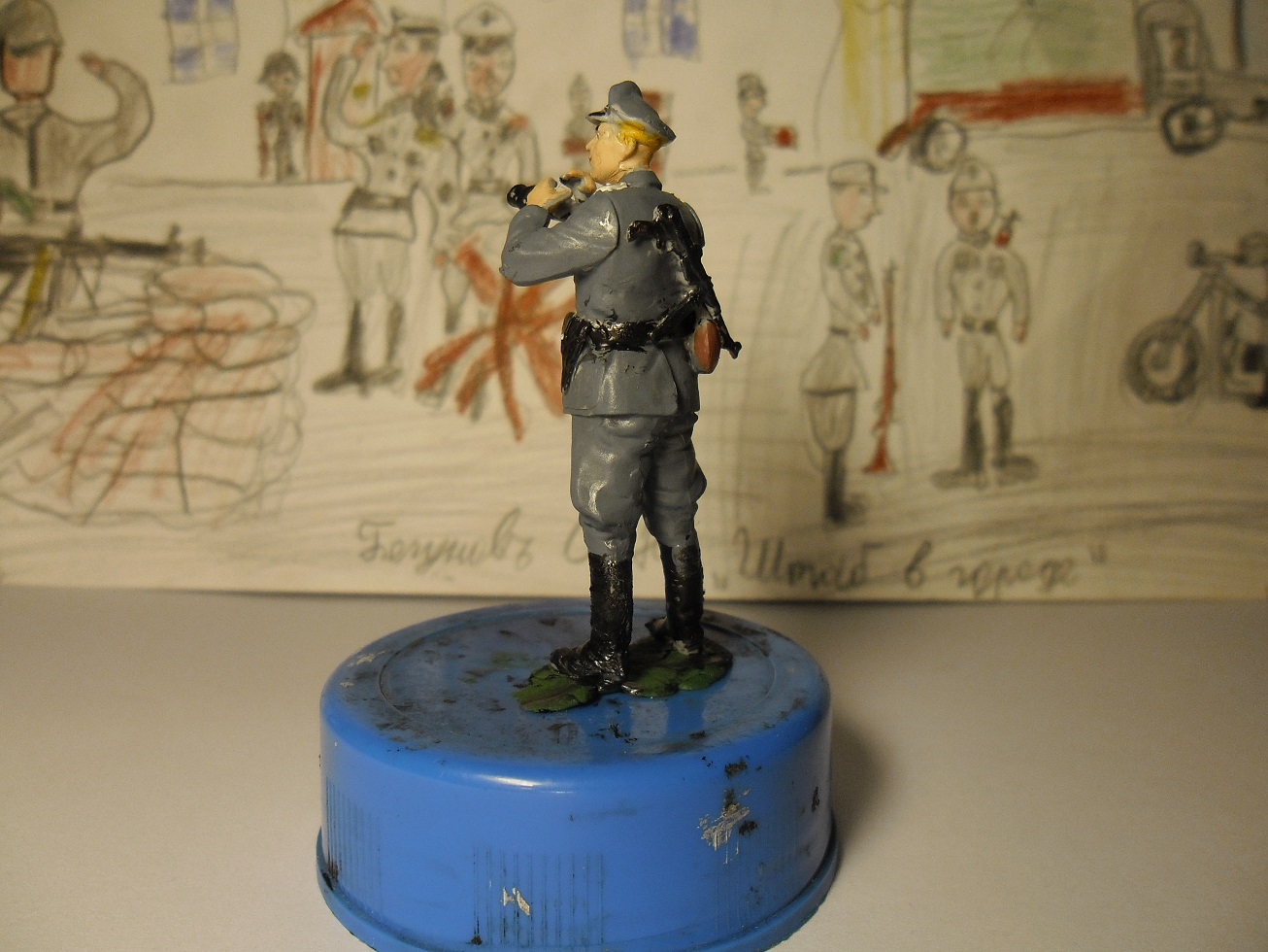 А теперь посмотри внимательно свои фото и исправь ошибки:непрокрашенные места надо аккуратно прокрасить,заляпанные места исправить,кожаный ремень и планшетку перекрасить в темнокоричневый цвет.Если есть матовый лак,покрасить всю фигурку,чтобы не блестела.Как исправишь,пересними и выложи здесь же,а мы посмотрим.Рисунок кстати классный.