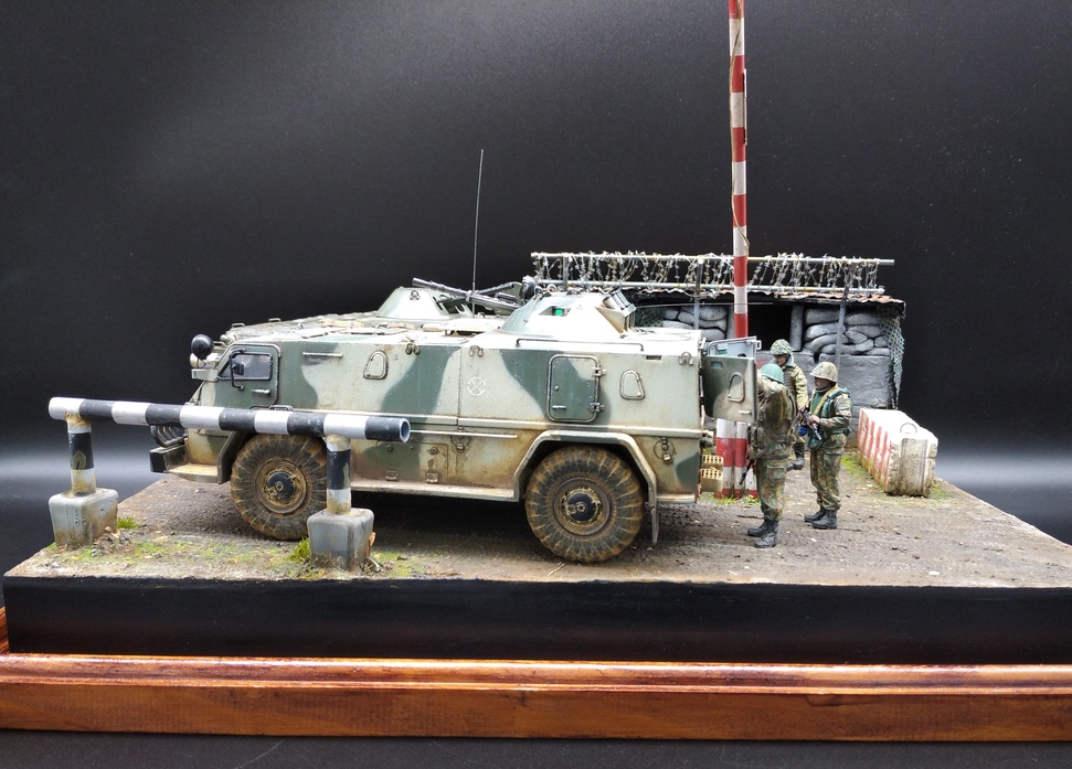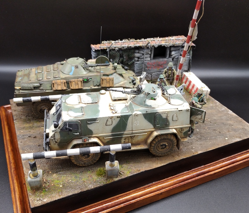Давным давно хотел сделать что-нибудь из темы на вторую чеченскую, в коей довелось поучаствовать командировками в ЧР. Сначала была мысль сделать ПВД в Гудере по своим фото с "Бардаком" (БРДМ),потом зашла тема с "Водником" ( бронеавтомобиль) в Ханкале. И в один прекрасный момент решил обе темы объединить в одну с композицией блокпоста,коими были утыканы все дороги тогдашней Чечни. Собственно, так и возник этот "Райский уголок" где-то в районе Герзельского моста. Жизнь на блокпостах кипела полным ходом, дневной зной менялся ночным диким холодом, обстрелы,провокации,досуг: кто во что горазд...ну и конечно, работа,работа... Проезжавший мимо "чудоавтомобиль" или как говорят,"коробочка", вызвал неподдельный интерес у обитателей поста.