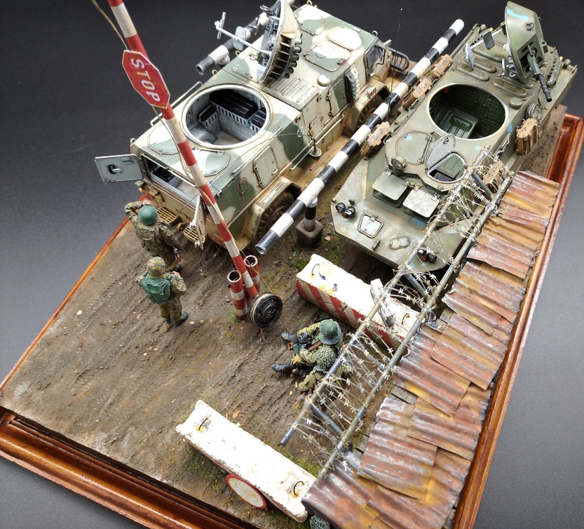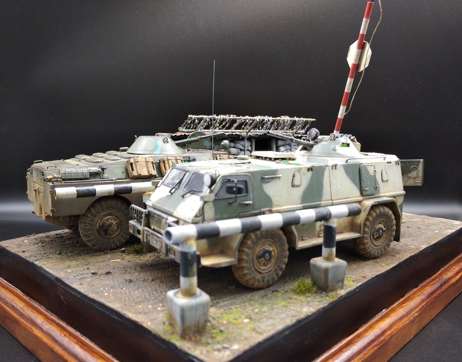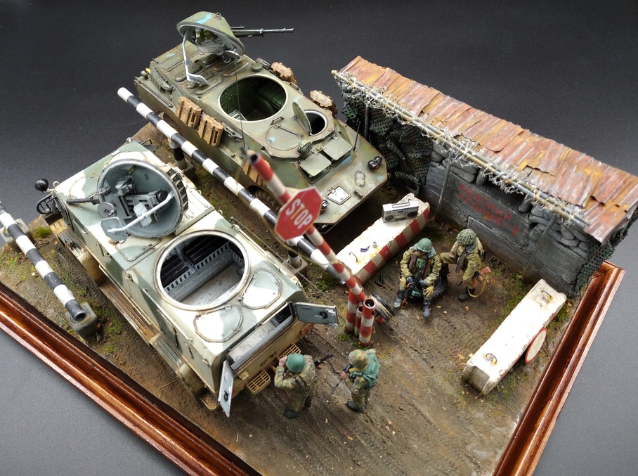 Помимо наборов моделей и фигурок для создания диорамы использовал пеноплекс,акриловую шпатлевку. Из полимерной глины изготовлены бетонные блоки и мешки объекта,которые масштабированы по стандартам ГОСТ. В работе использовал фототравление от "Микродизайна",мелочевку от ДМС и вязальные спицы для изготовления ограждений и шлагбаума. Окрашивал всё акрилом разных производителей и маслом. Обе машины деталированы внутри,поэтому сделал фото со снятыми башнями тоже.
