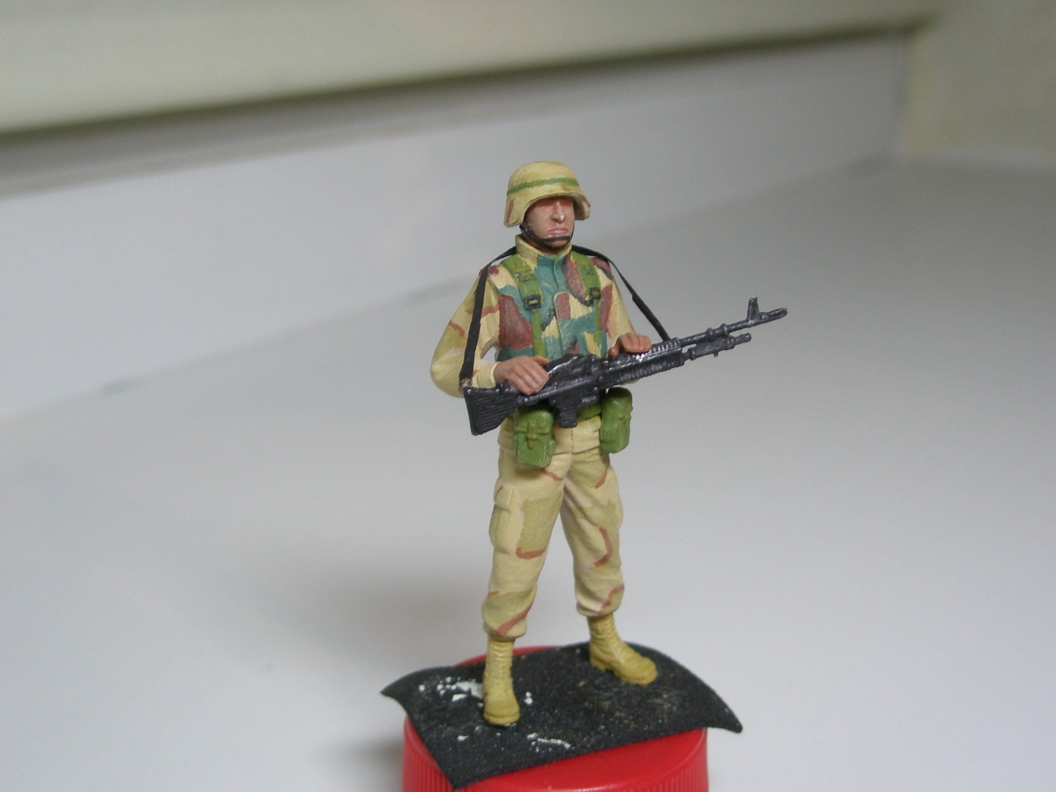 Наконец-то я закончил чвою свою первую фигуру набра ICM "American Elite forces in Iraq" в масштабе 1:35 и выкладываю ее на всеобщее обозрение (учитывая уровень работы отсылать для галереии не рискнул). Окрашивалось Харьковским акрилом "Хома", из доработок пулеметный ремень и ремень на каску - сигаретная фольга. Пытался также из фольги зделать нарукавные нашивки первой пехотной дивизии, но к сожалению ничего не получилось.
