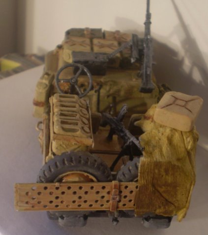 Джип от Tamiya(35033)очень не плох в сборке,но не большие дороботки потребовались.Из доработок:лента на пулемёт,канистры немецкие,"ручки" для канистр из поллистирола.Окраска-кисть акрил звезды пигменты от Tamiya.Это моя первая серьёзная модель.