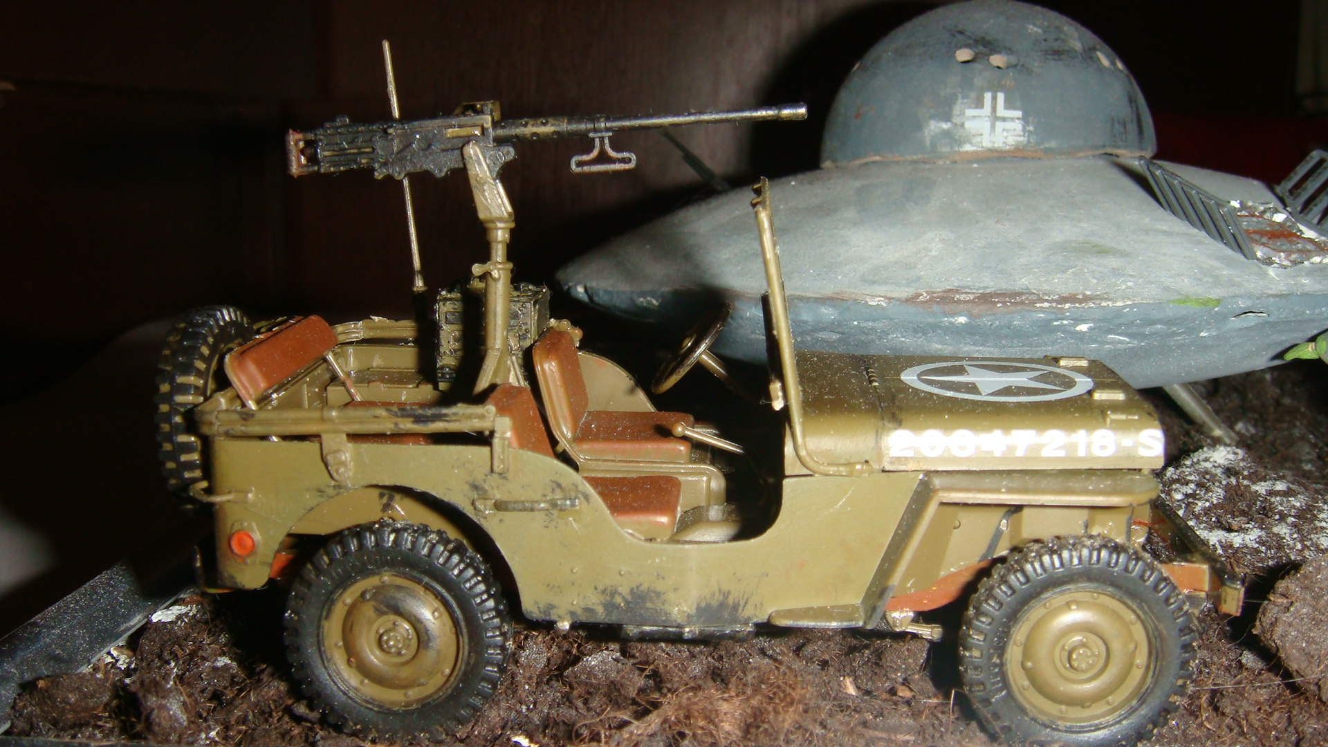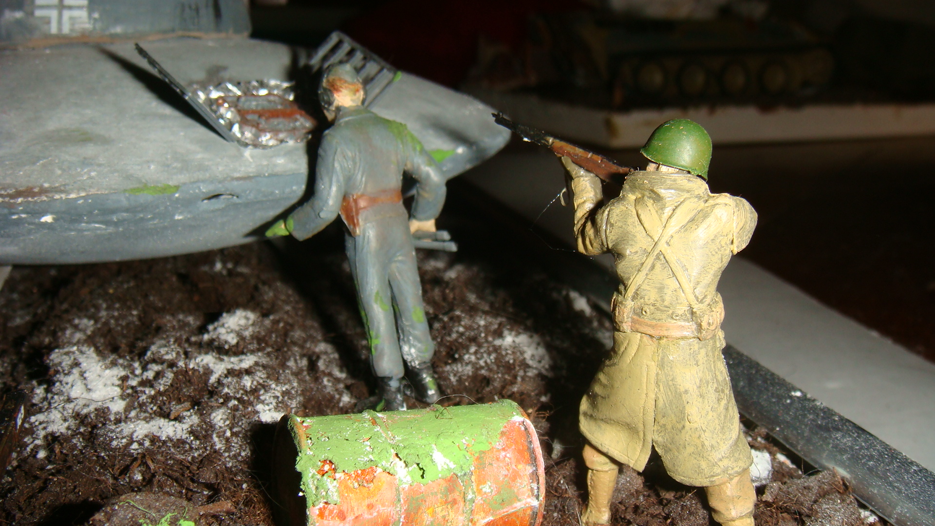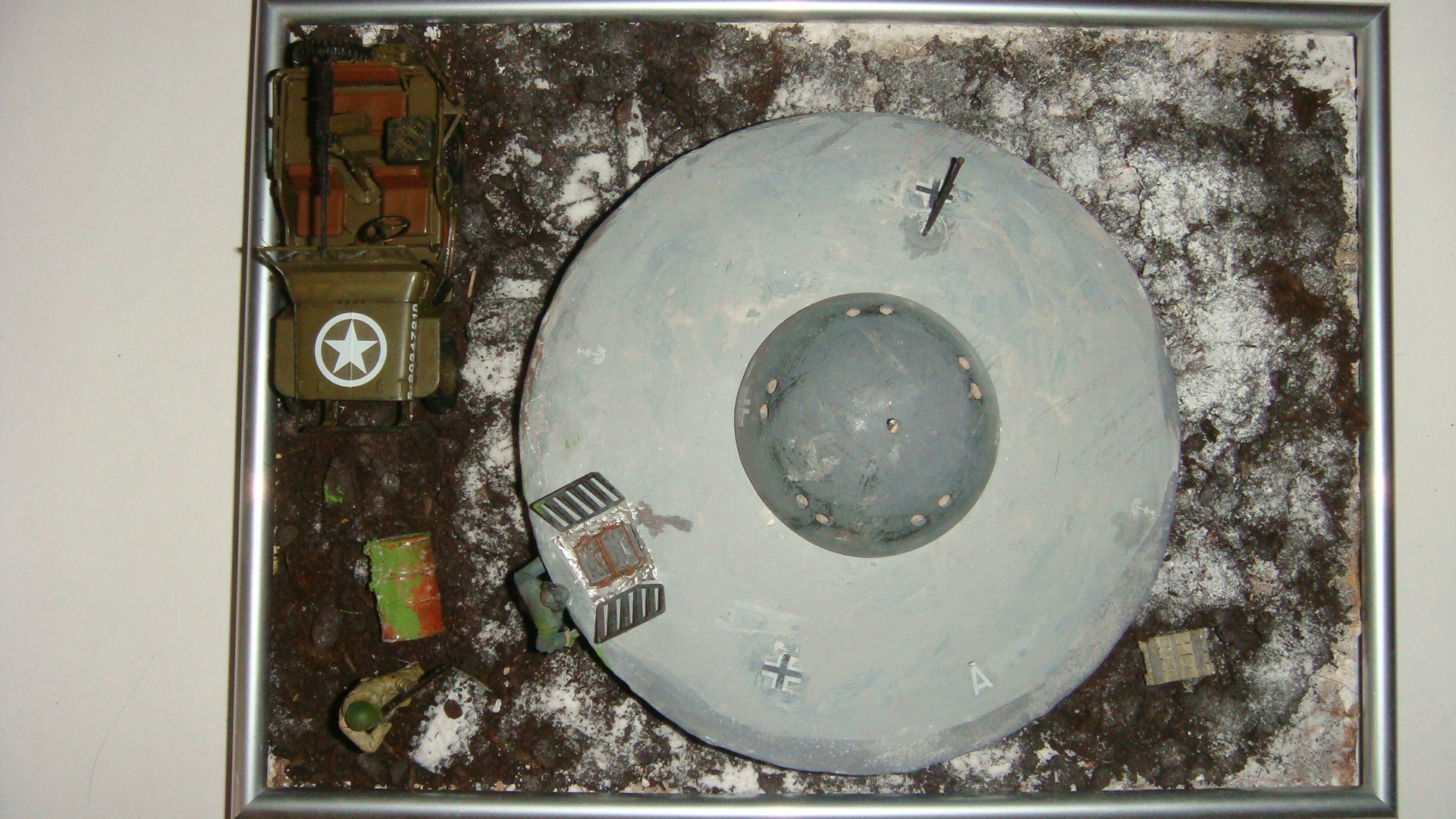 Ну судя по зеленной массе на бочке, инопланетянина размазали именно по ней и скорее всего это сделал немец в наушниках так как следы этого инопланетянина видны на его форме. После он решил завладеть данным девайсом поэтому наклеил вырезанные из целлофана кресты на "тарелку" и решил засунуть вовнутрь рацию в подарочной обертке. Все это заметил подоспевший амер, которого не заметил, увлеченный своим делом фриц, к тому же наушники надо снимать, тоды может хотя бы услышал вплотную подкативший джип. Думаю для фрица все закончится плачевно, так как он еще видимо не понял что происходит вокруг него, а амеры как известно два раза сдаваться не предлагают