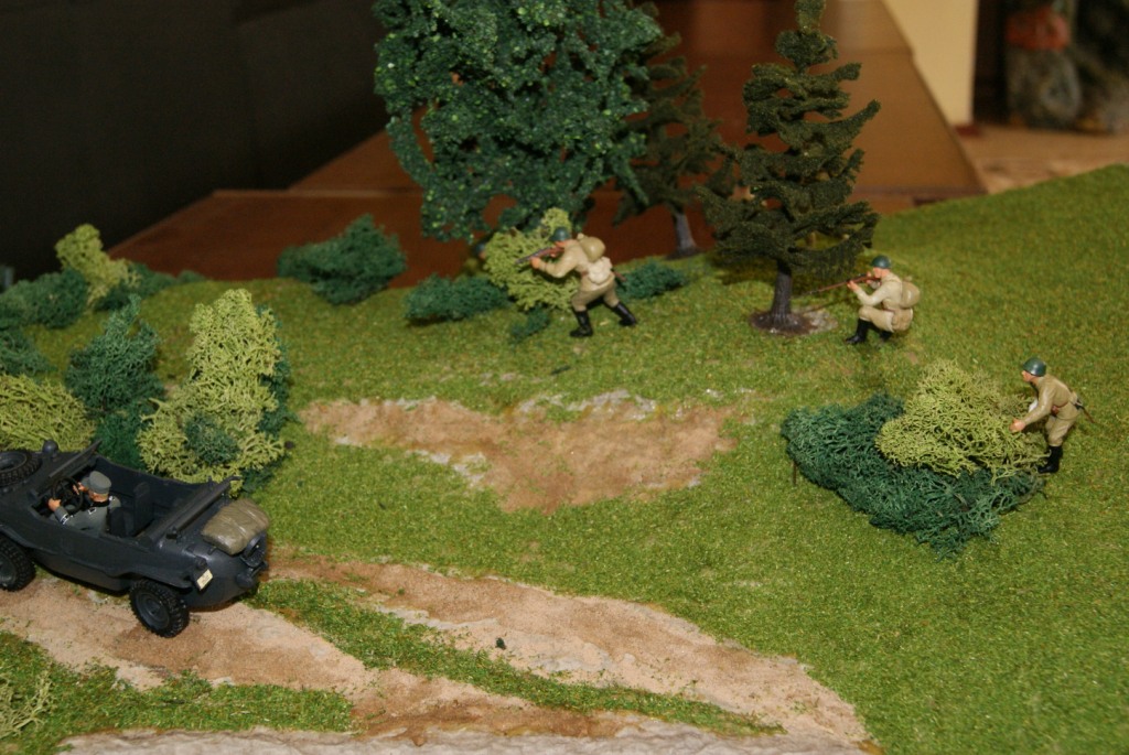 Изначально идеей диорамы был выход из окружения частей 11 армии и фигур должно быть больше и разнообразнее. В данном случае: нападение бойцов РККА на саперно-рекогносцировочное подразделение Дивизии СС "Мертвая голова".