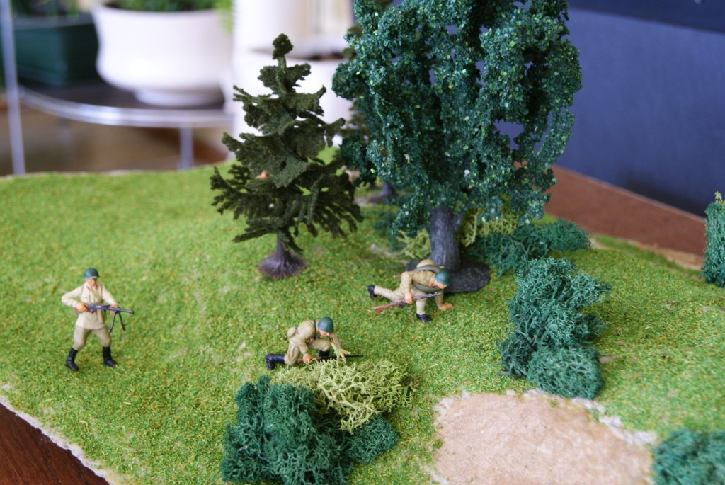 Теперь о диораме. Своим рождением она обязана заказу к 9 мая из детского садика. Срок был 3 дня. Так как все модели были собраны давно, то на так сказать "сборку и озеленение" я потратил 3 вечера и полночи:)