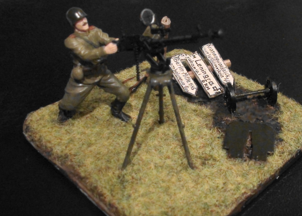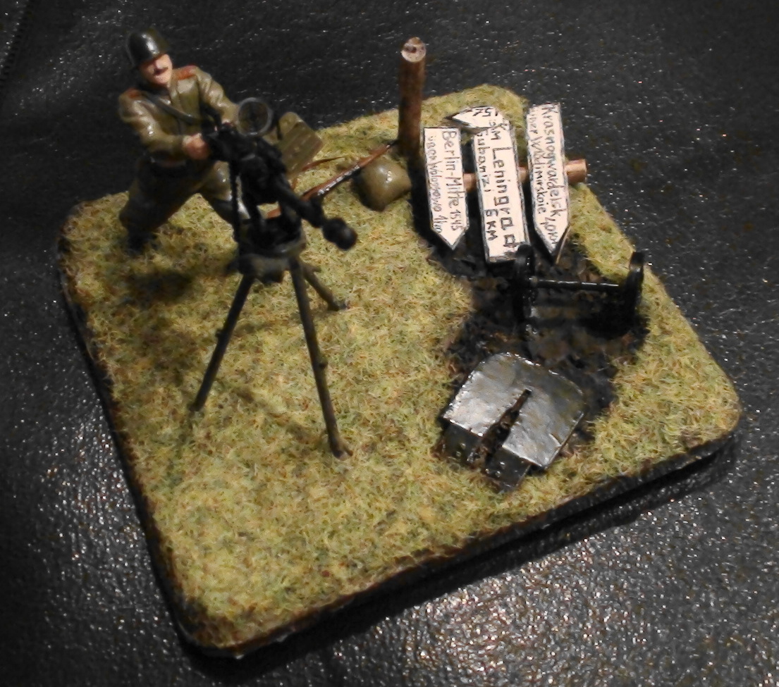 Это моя первая виньетка, поэтому с удовольствием выслушаю критику и советы более опытных коллег. Пулемет ДШК и пехотинец - "Звезда". Основание гипс, трава от "Звезды". Окрашено акрилом "Звезда" и "Тamya". Указатели самодельные, из палочки от мороженного.