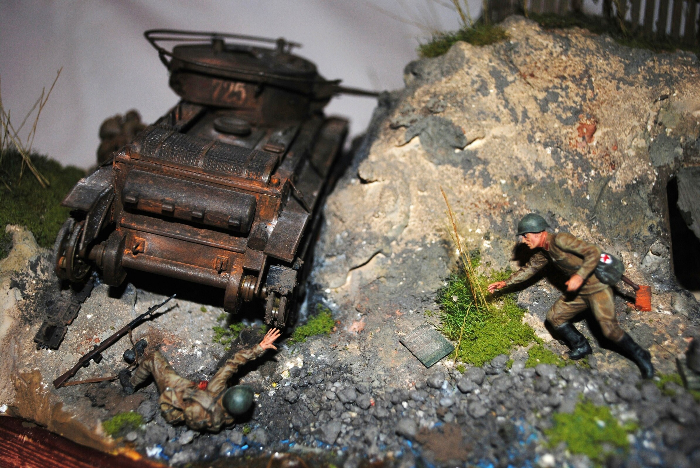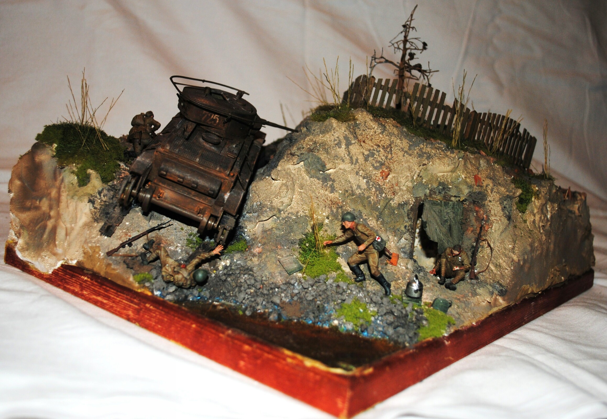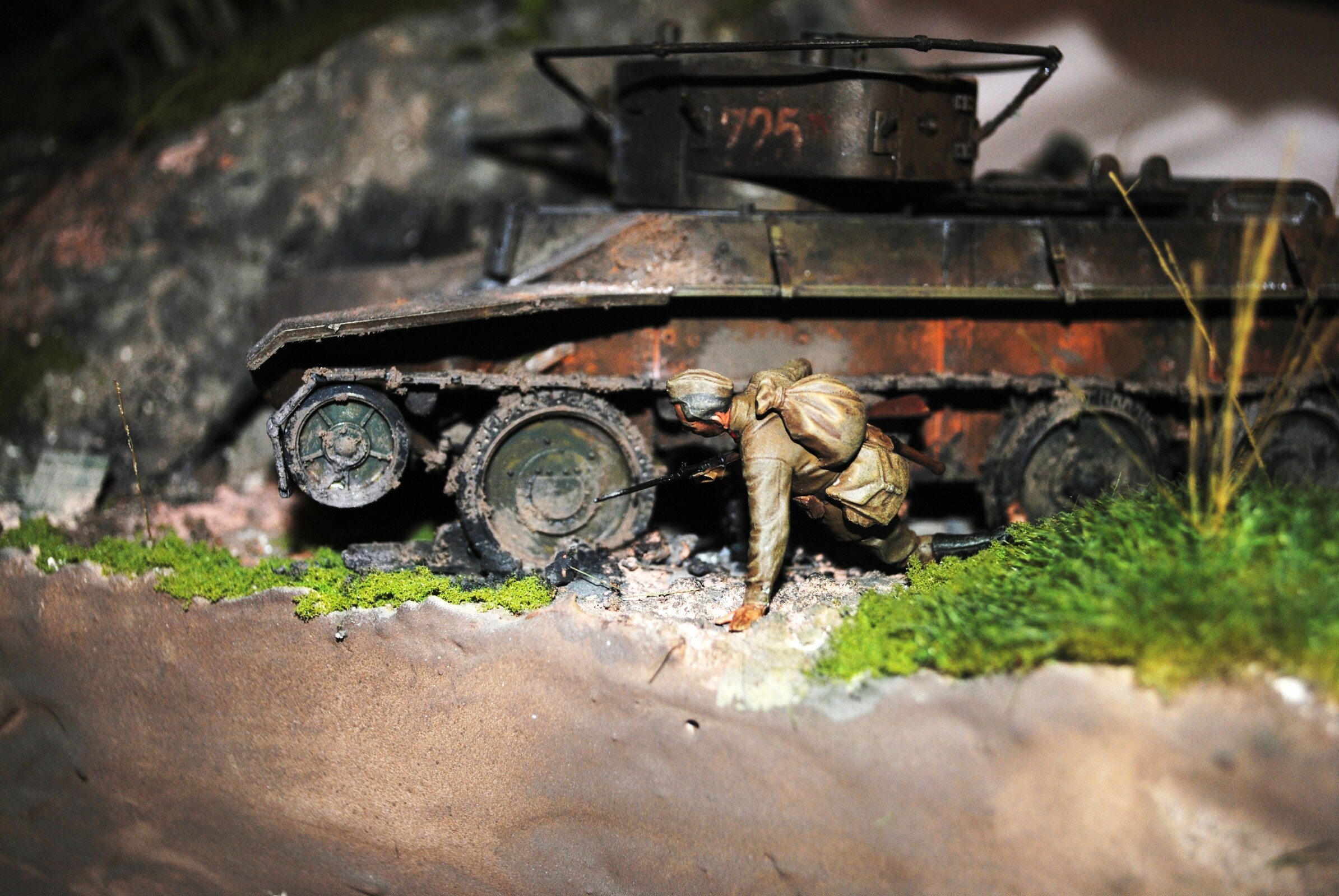 Делал диораму по фотографии, опубликованной в книге Бориса Пидемского "Под стук метронома". Постараюсь отсканировать ее и выложить либо на форум , либо в виде ссылки. На ней изображены подбитые танки БТ, погода достаточно ясная, снега не видно и складывается впечатление.что достаточно тепло.