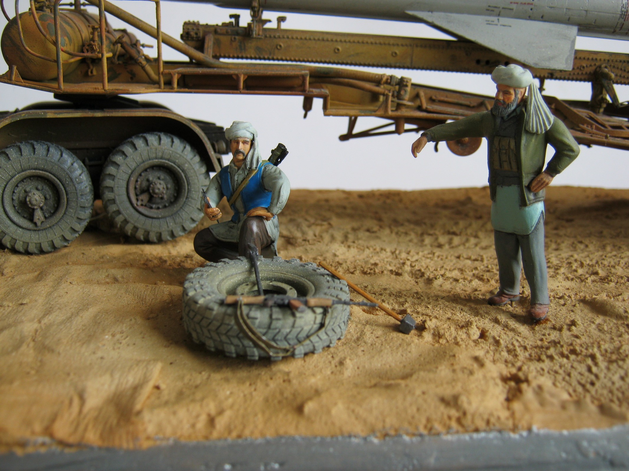 К сожалению, отсутствуют в широком ассортименте солдаты Египетской армии времен 1970-73 гг. Вот с ними сюжет бы точно заиграл без натяжек: и песчано-камуфляжный окрас, и недоумение персонала. А для Афгана такая окраска выглядит сомнительной: комплексов С-75 в Афганистан было поставлено всего 16 штук (при всех властях), прикрывали они, скорее всего, Кабул да Баграм, и при такой службе камуфлировать их большого смысла не было, равно как и наносить на дверцы трехзначные номера по образцу БТТ. А жаль, камуфляж нанесен красиво, да и состарен весьма зрелищно.