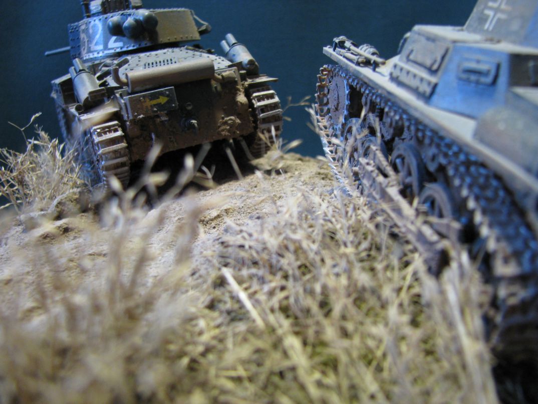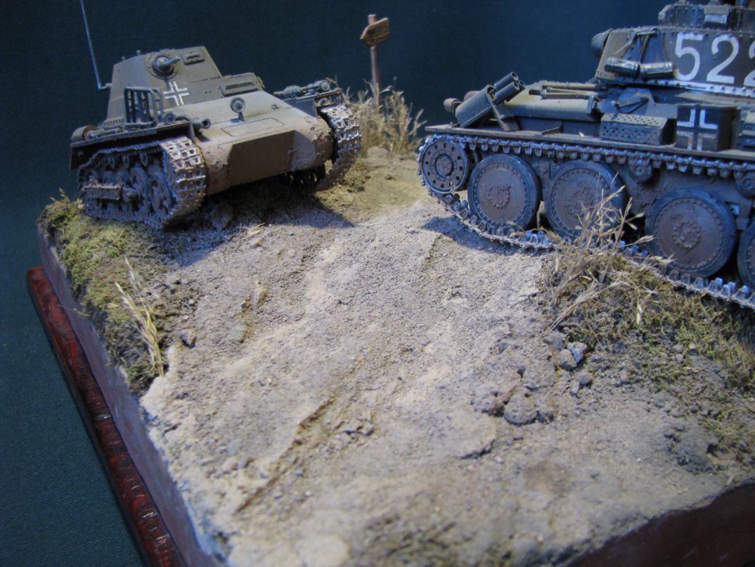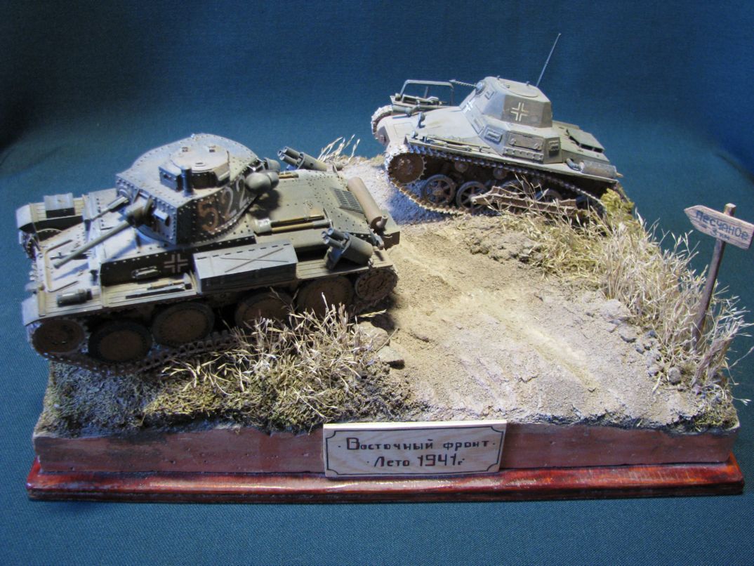 Максим Пешков, очень и очень здорово для первой работы. Искренне поздравляю. Небольшая критика, так сказать, ИМХО. Во-первых, всё же не хватает фигурок, это бы оживило диораму. Во-вторых, летом 41-го для немцев было важно хапнуть земли, поэтому танки, там где это было возможно, ехали по дорогам. Ну и в-третьих, номера наносились в панцерваффе по чётким регламентам, а не от руки.