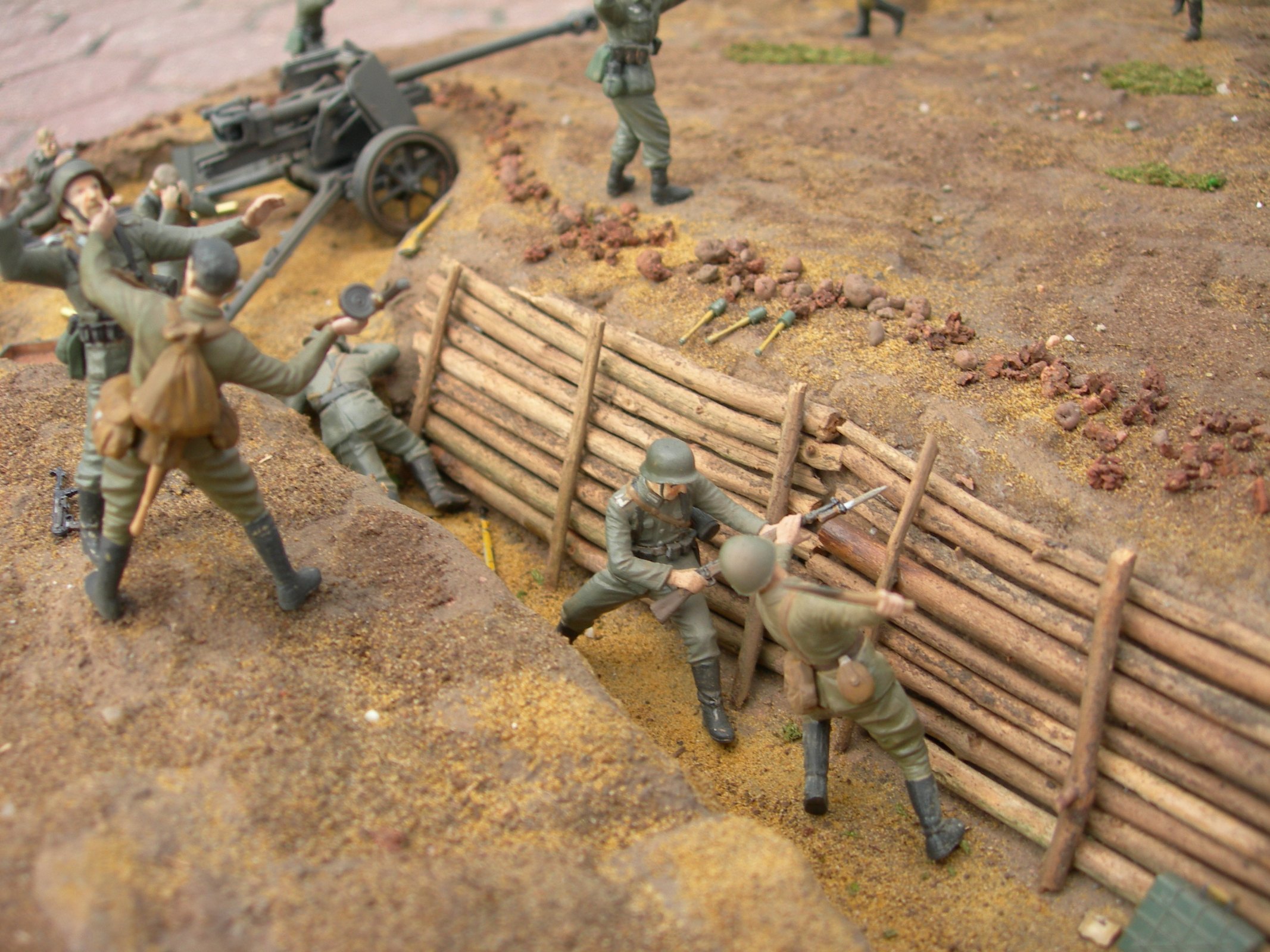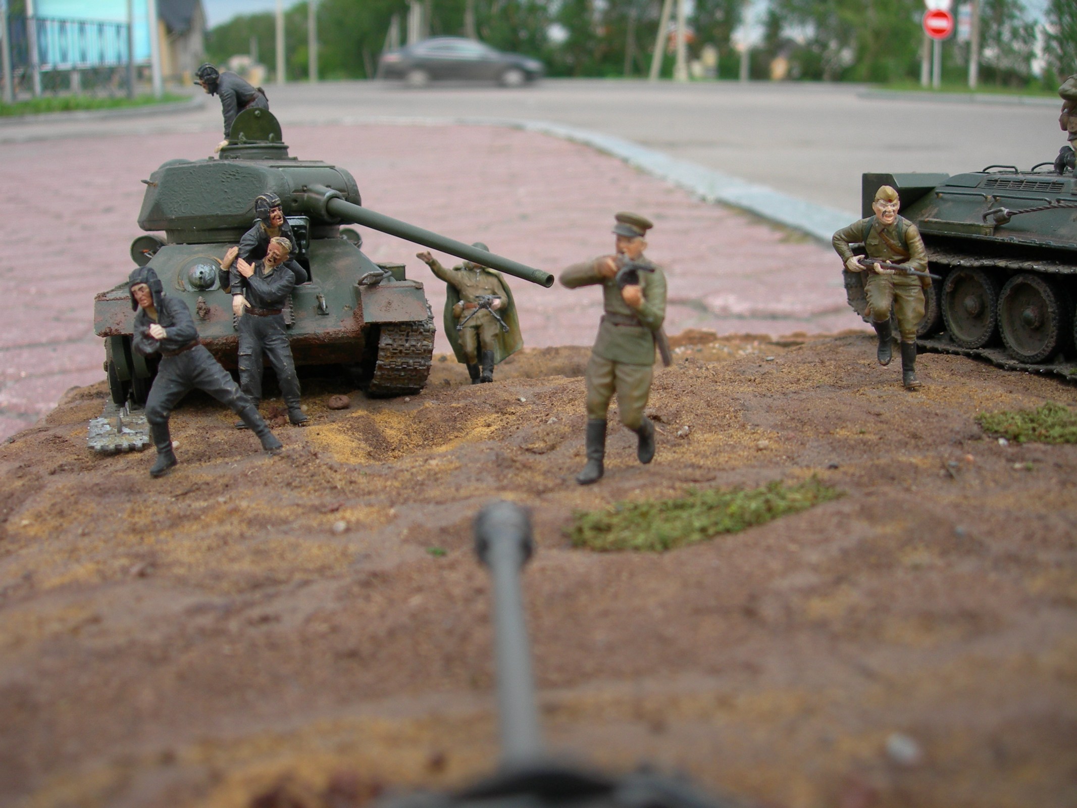 Присоединюсь к коллегам - работы сделано много, но это теряется из-за тяги к гигантизму. В результате нет общей диорамы, а есть танки и фигурки, расставленные в хаотичном порядке. Например - зачем человек в плащ-палатке тянется к подбитому танку? Как бьющий автоматом красноармеец оказался на той стороне окопа? И вопросов таких очень много.