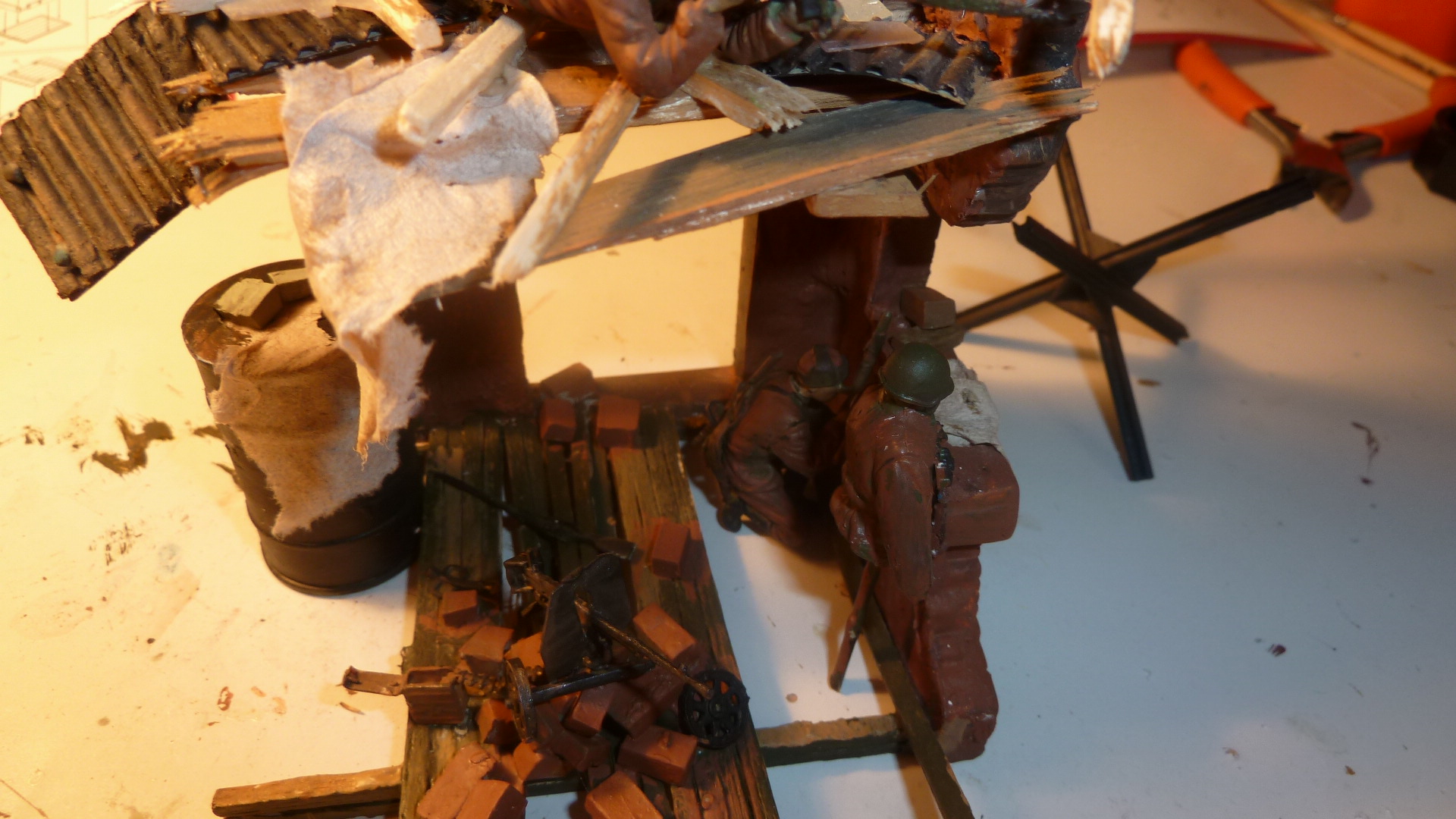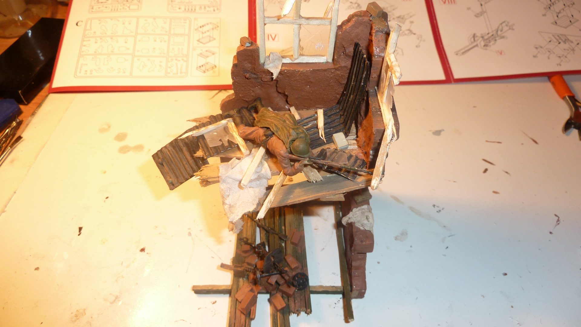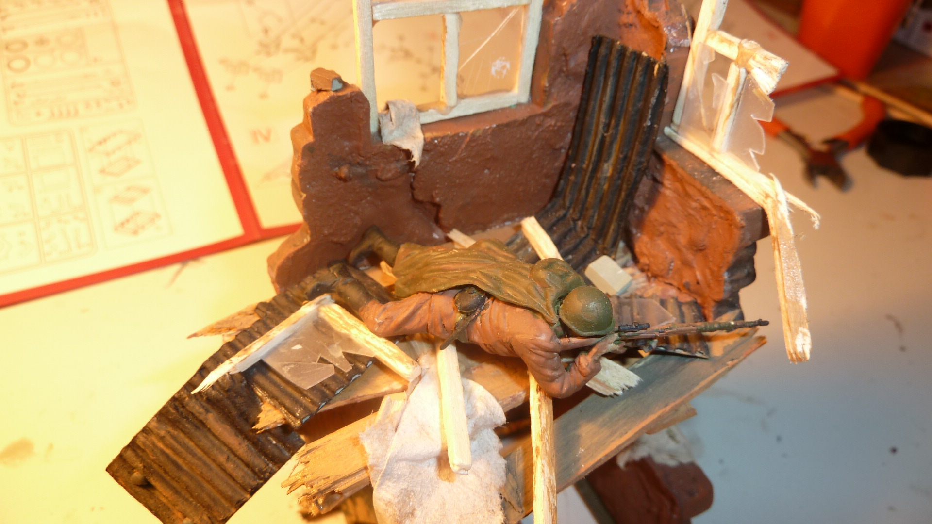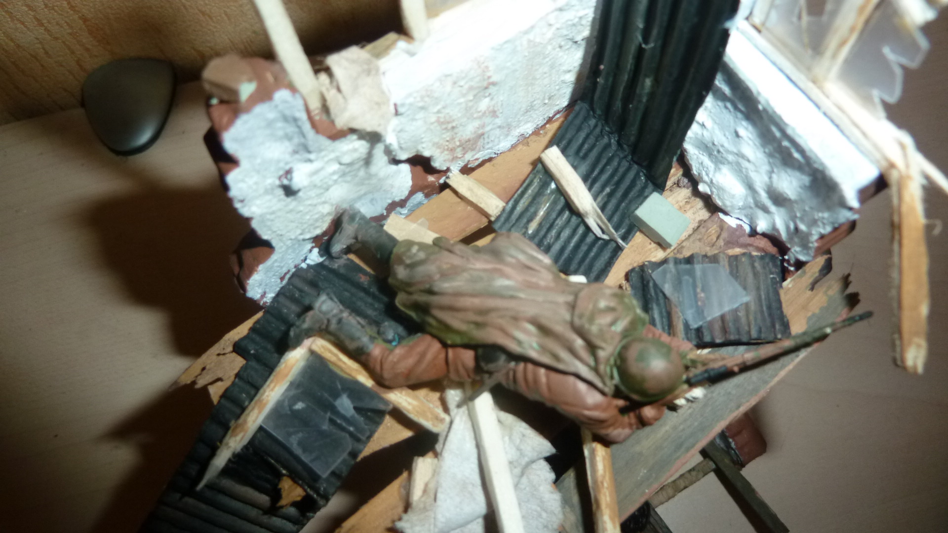 1)Здание делал сам. Откопал в свои пластмассовых солдатиков различные строения.Заполнил пустоты во внешний стороне гипсом. Перекрытие из обломков линейки. Листы железа обычный картон в разрезе окрашенный в чёрный цвет(добавил пигмент ржавчины) Рамы,полы из соломки, продают в книжных магазинах (соломки в наборе нужны для постройки различных изб,церквей и.т.д., но их можно использовать и в других целях,настоящий подарок для моделиста). Кирпичи изготовил из детской глины,окрасил. Тряпки, туалетная бумага смоченная в воде с пва.Стёкла тоненькое орк-стикло,встречается в подарочных магазинов это различные упаковки ёлочных игрушек и прочего (осколки нарезал просто на мелкие кусочки)Плакаты прост распечатал на принтере (маленько состарил).